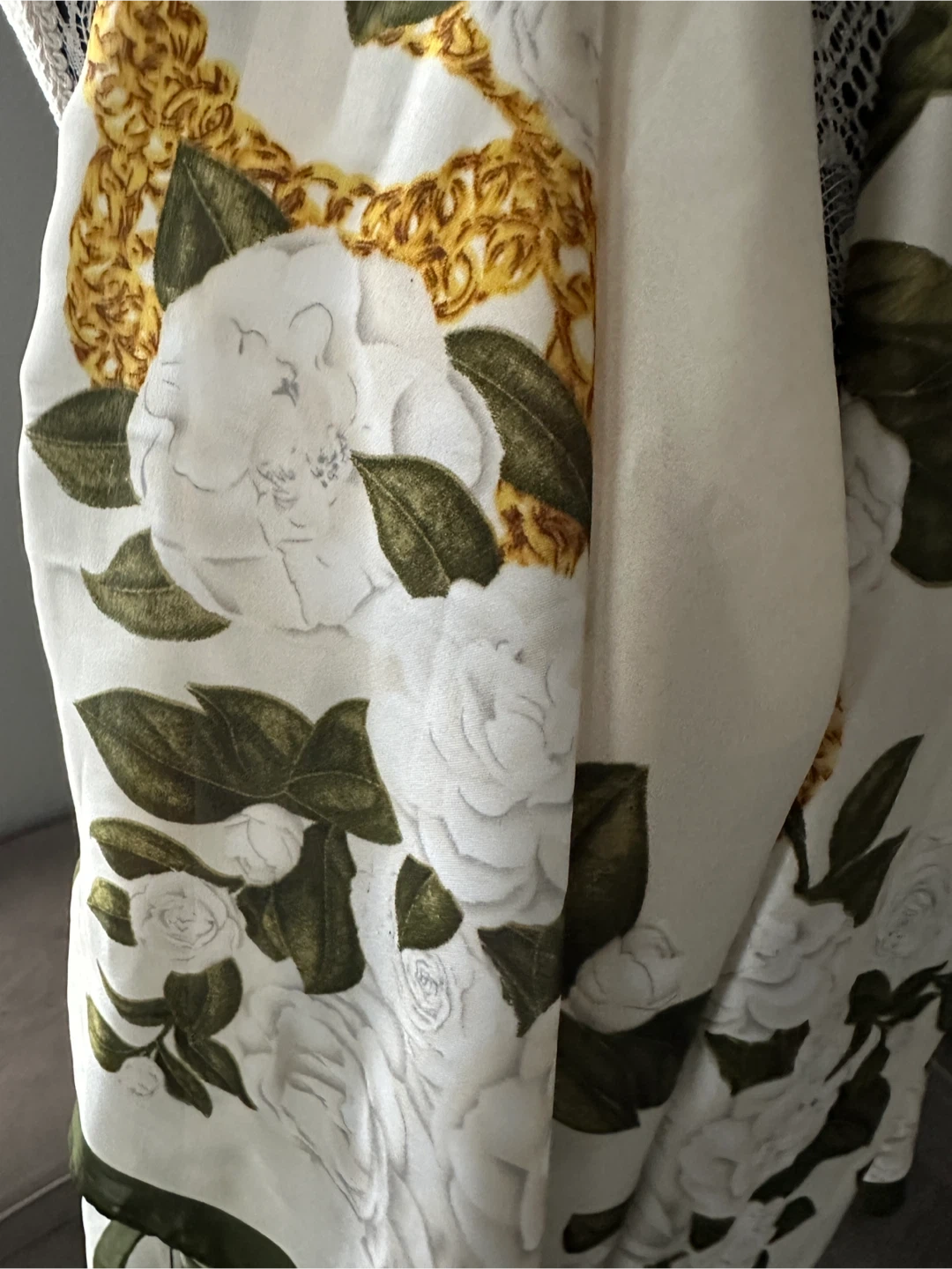 Beautiful floral print scarf. The scarf features a lovely design with white flowers and green leaves, accented by a gold chain pattern. Perfect for adding a touch of elegance to any outfit