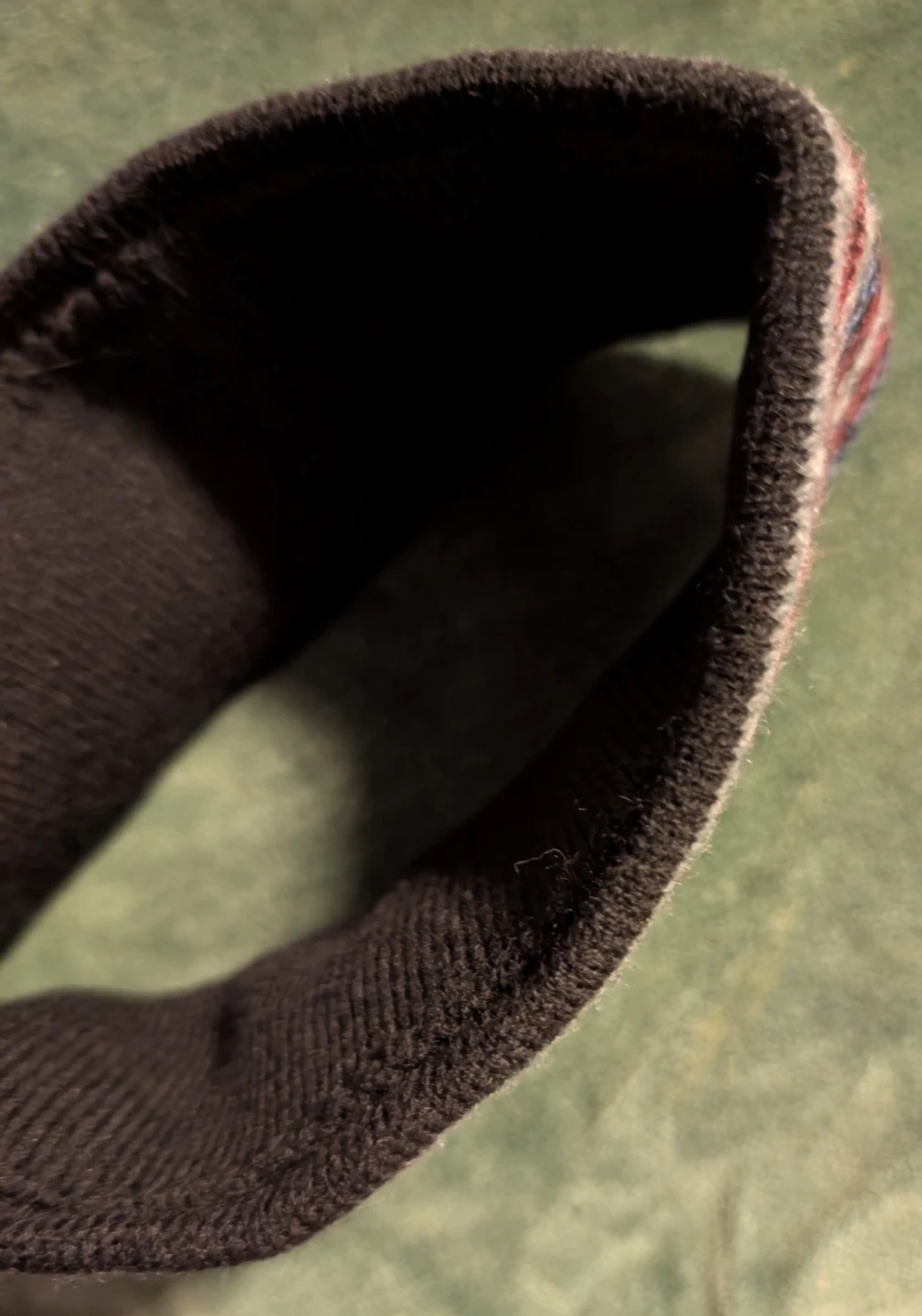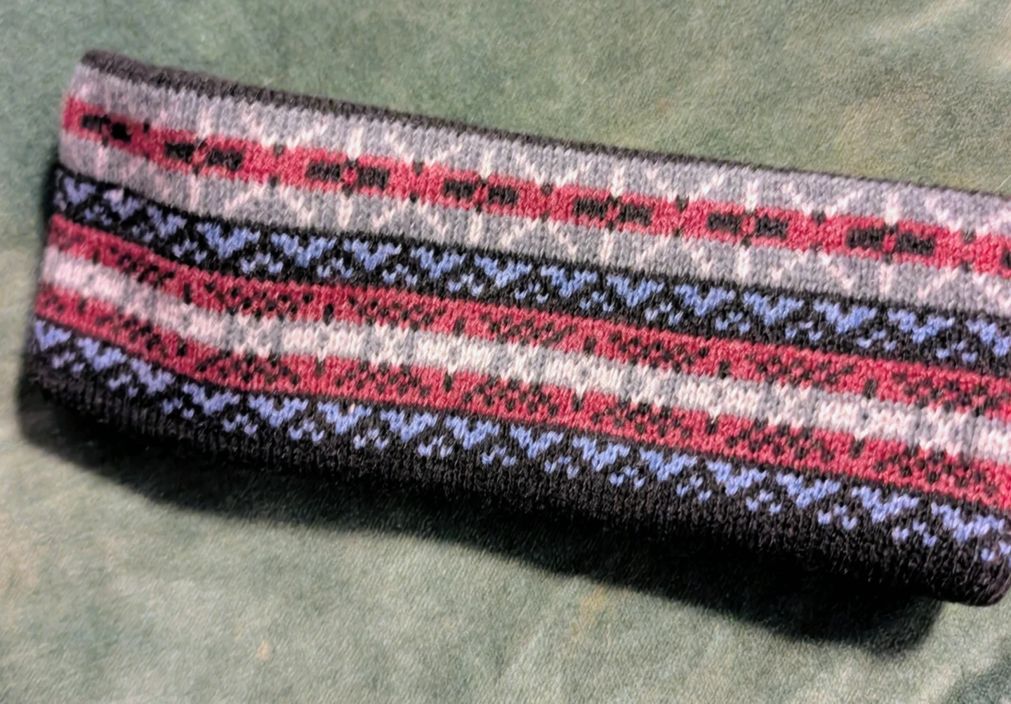 Selling a cozy, kids winter headband. It features a colourful fair isle pattern with black, grey, red, white, and blue accents. Perfect for keeping your ears warm during the colder months!