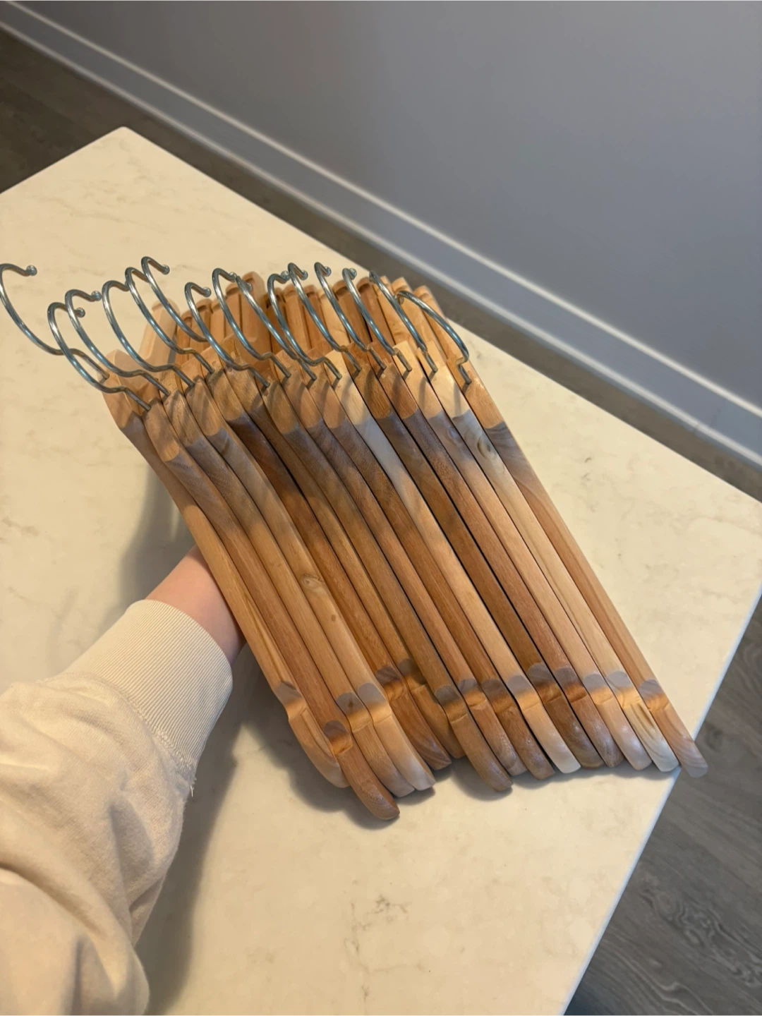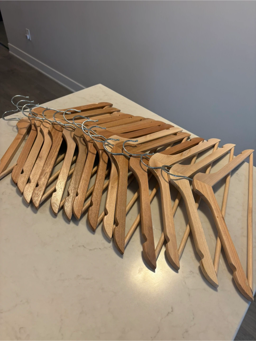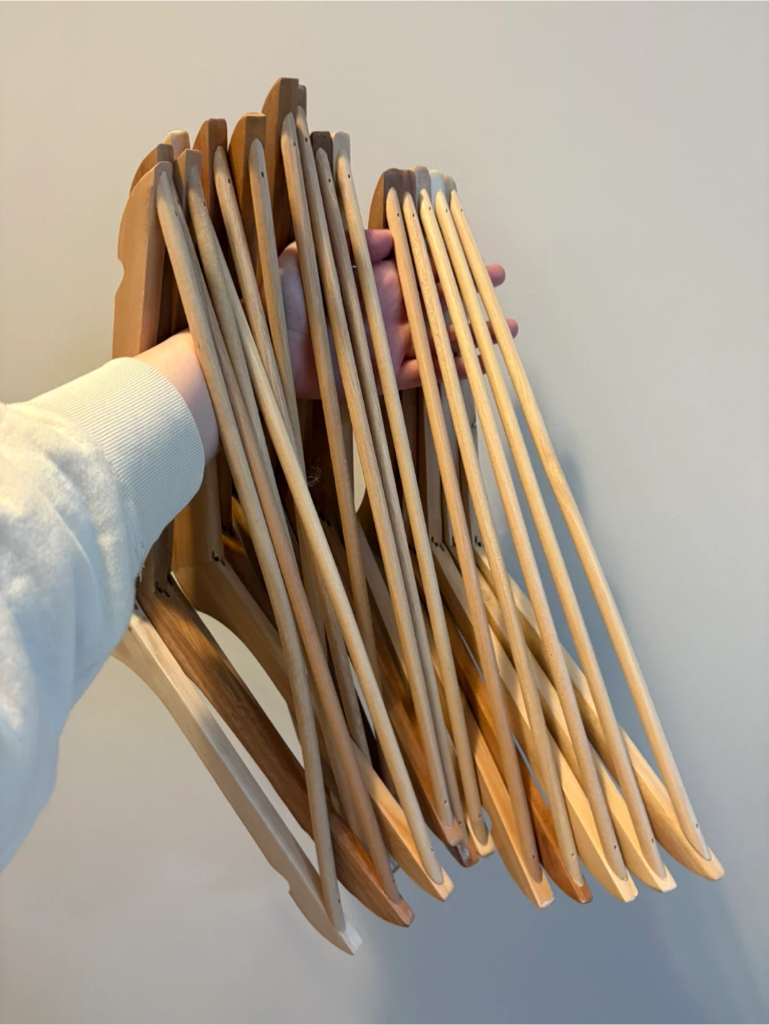 Gently used IKEA BUMERANG wooden hangers in natural colour.