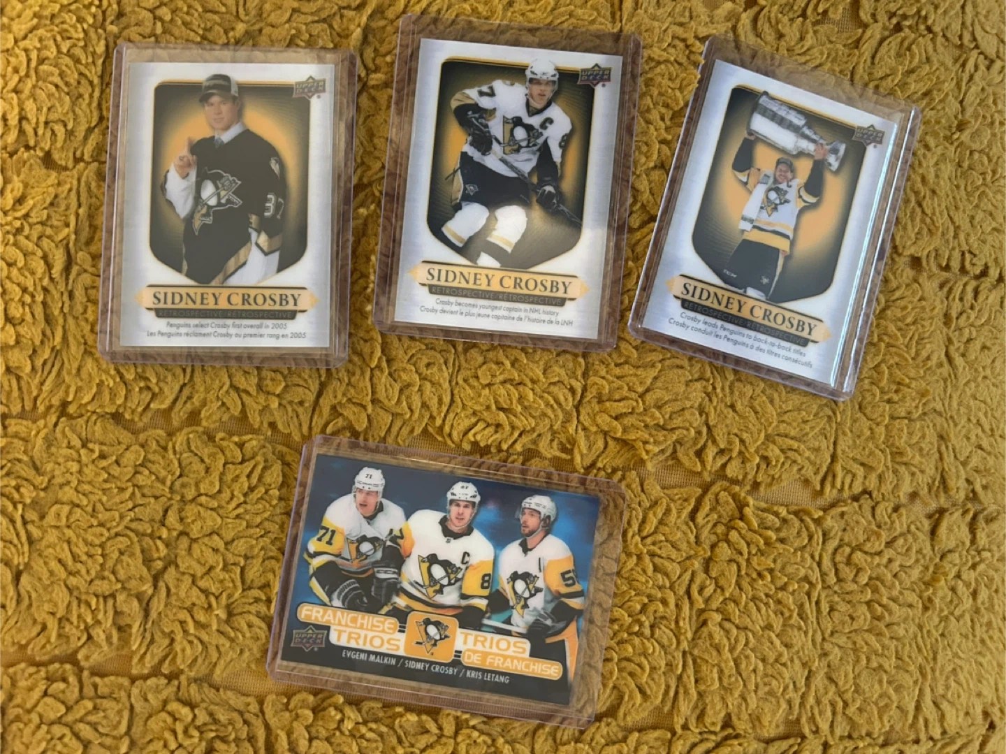 Selling a few Sidney Crosby and Pittsburgh Penguins hockey cards! These are from Upper Deck and feature Crosby in different stages of his career, including his early years and Stanley Cup wins. One card also features Malkin and Letang! A great addition for any hockey fan or card collector