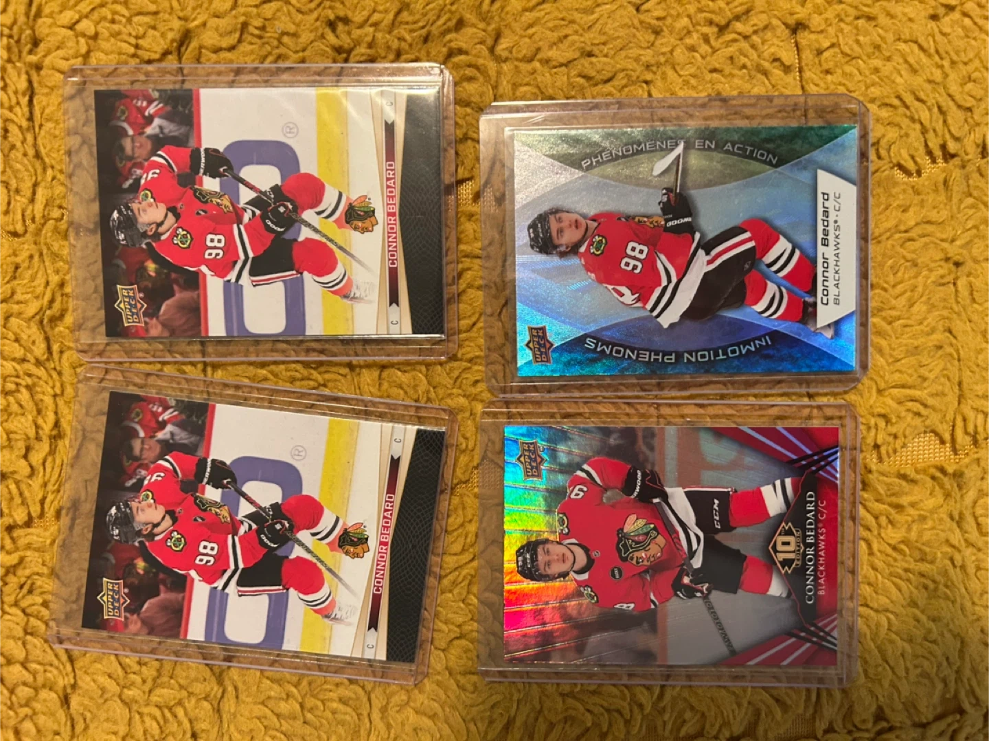Selling a collection of Connor Bedard Upper Deck hockey cards. These cards feature the up-and-coming hockey star in action for the Blackhawks. A great addition for any hockey fan or card collector!