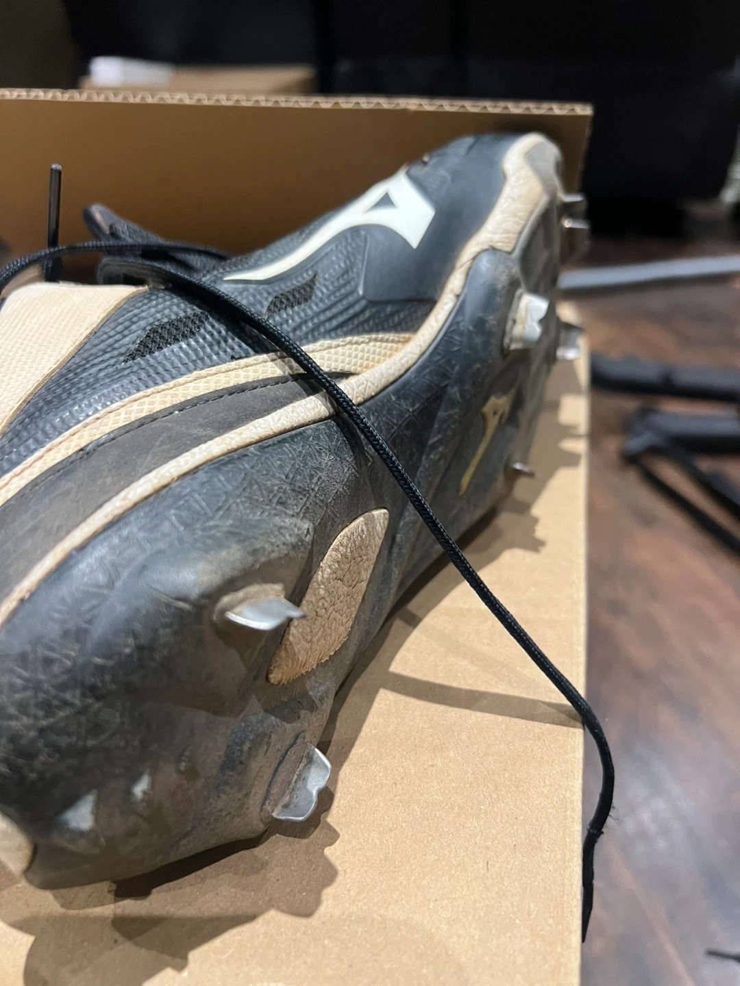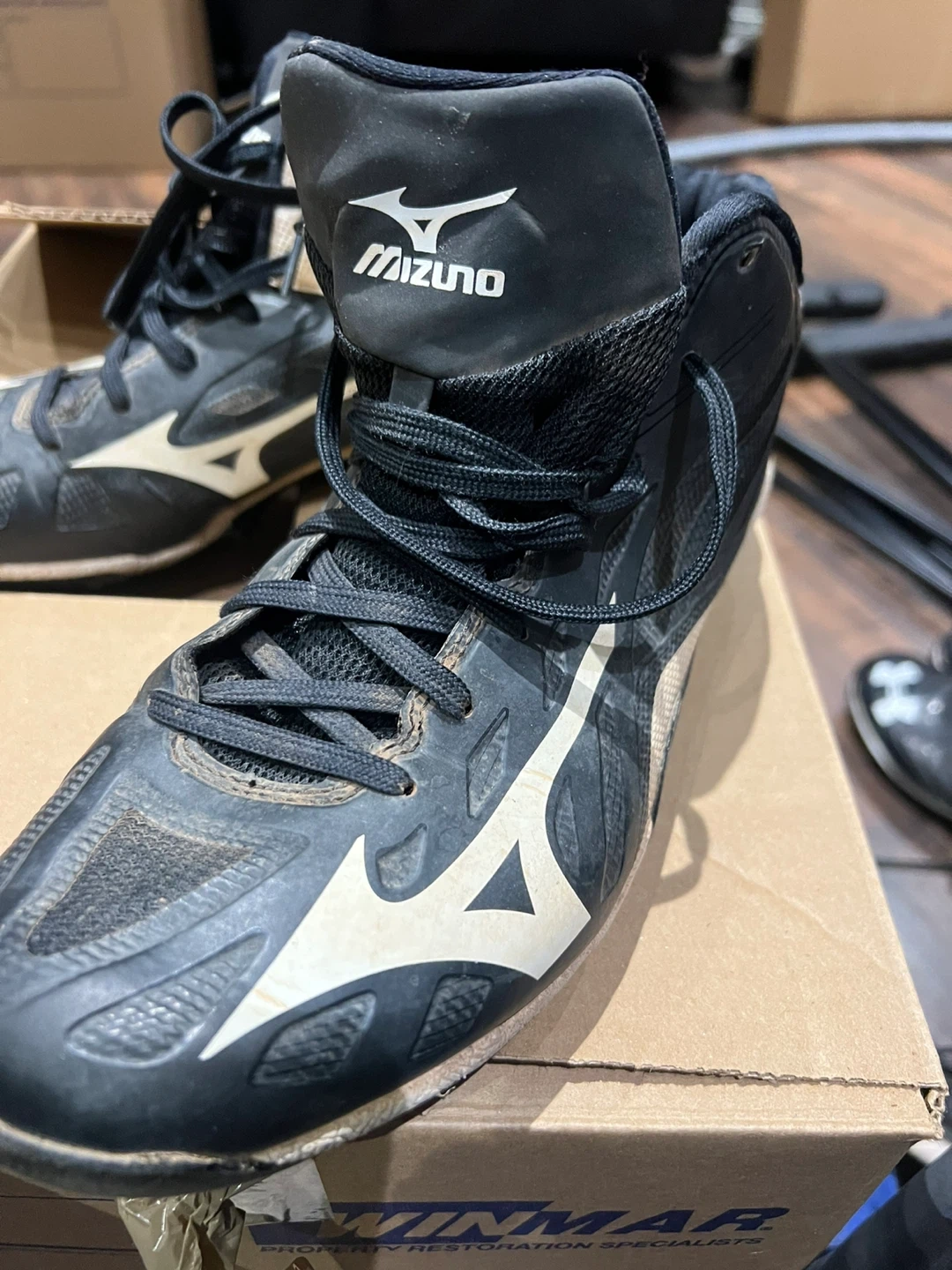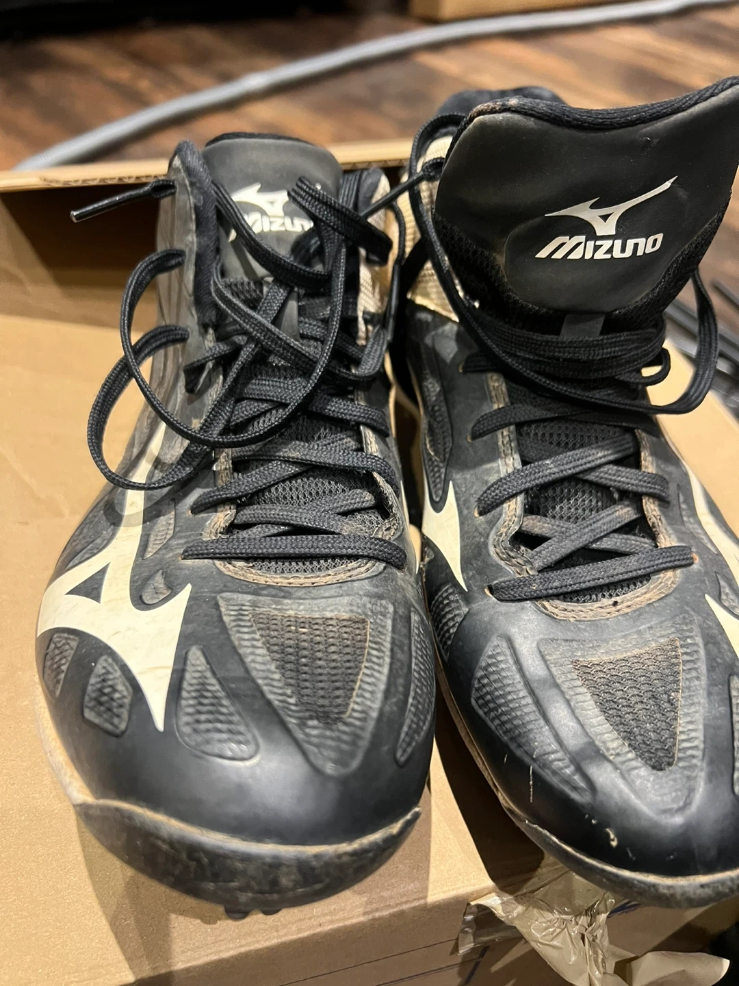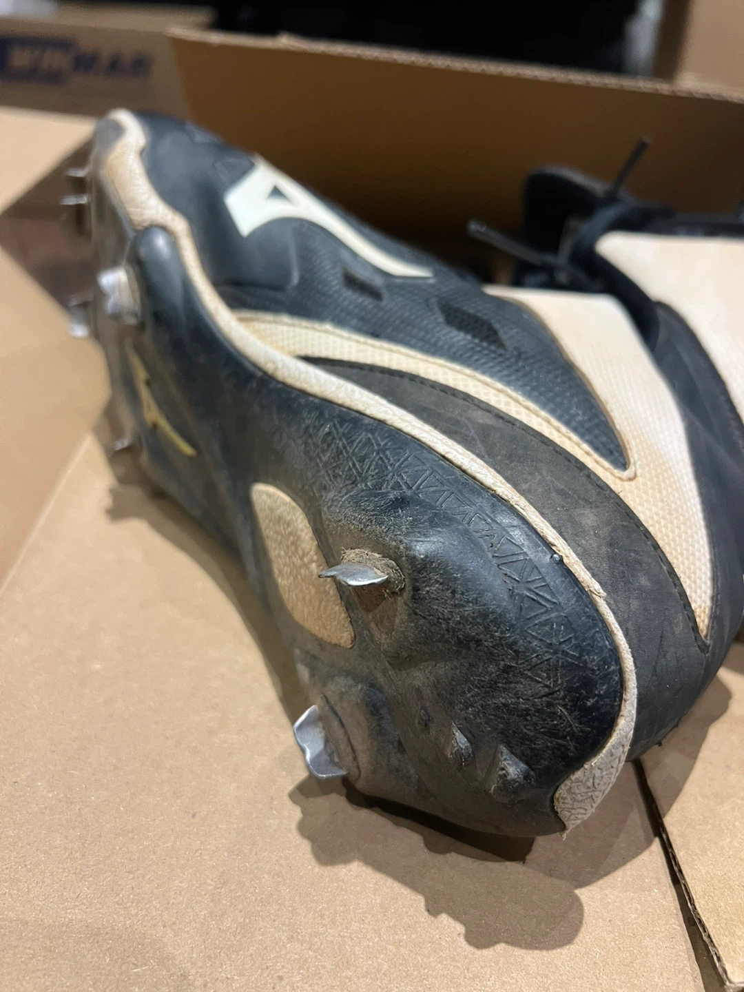 pair of Mizuno baseball metal cleats. They're black and white they're still in good condition for playing ball. Size 10