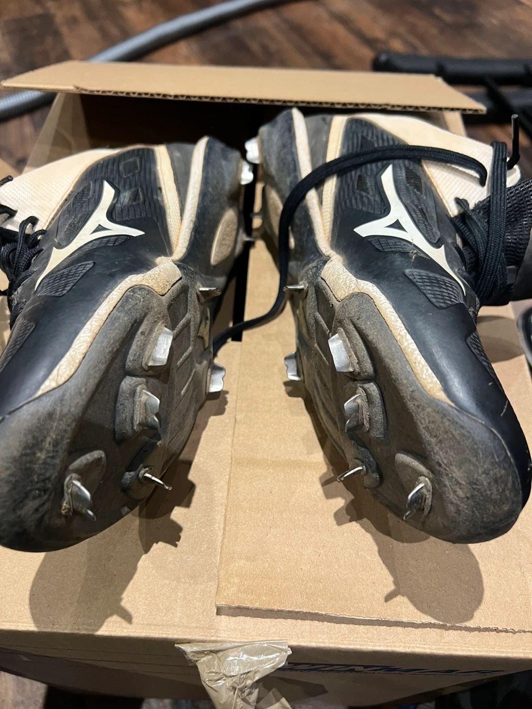 pair of Mizuno baseball metal cleats. They're black and white they're still in good condition for playing ball. Size 10
