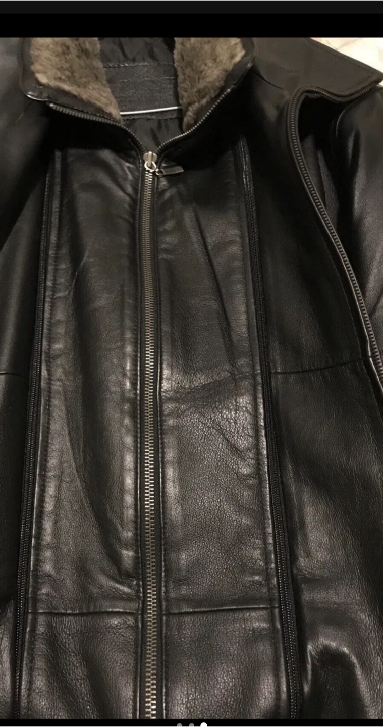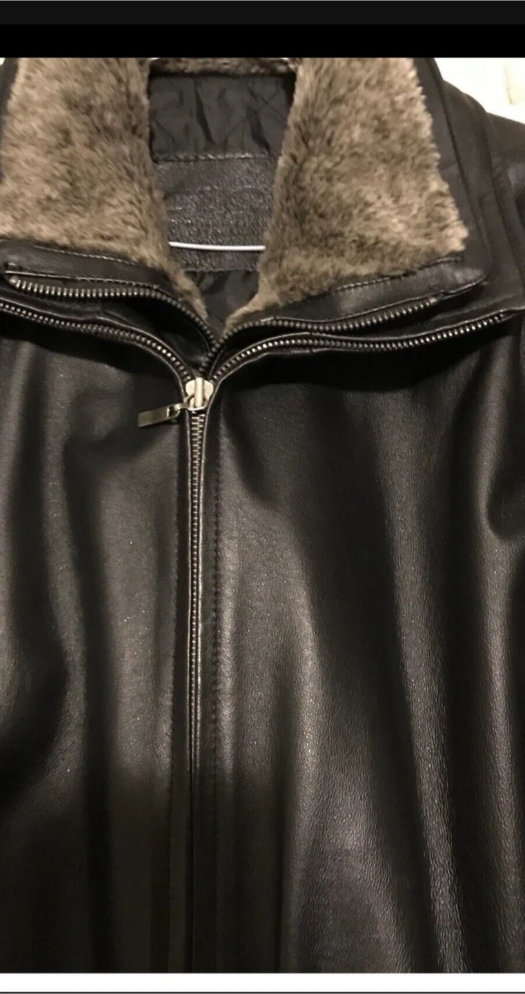 Here's a classic black leather jacket with a cozy fur collar! It's in great condition and perfect for adding a touch of style to your wardrobe. The jacket features a full double zipper and a comfortable fit. The inside has a quilted lining for extra warmth.
