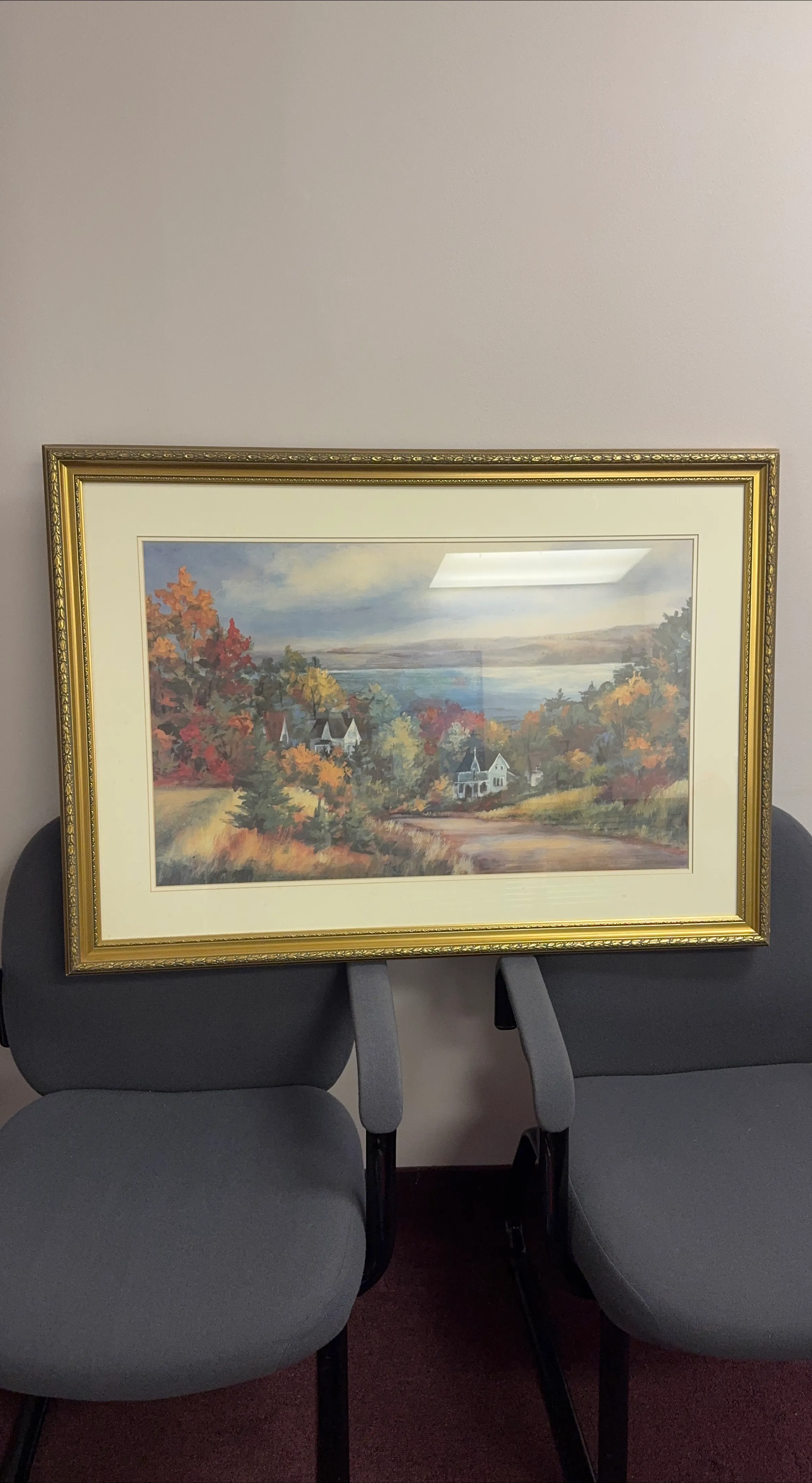 Beautiful framed landscape painting with a gold frame. It depicts a serene countryside scene with houses, trees, and a lake. Perfect for adding a touch of nature to your home decor