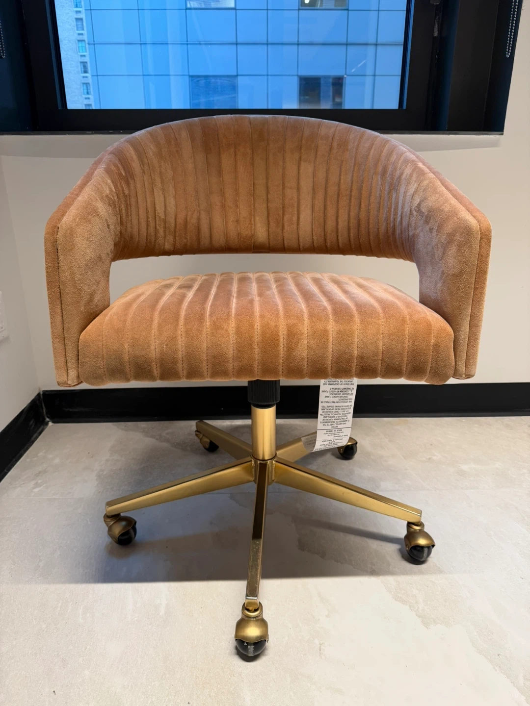 Selling a tan suede swivel desk chair. It's in great condition and would be a stylish addition to any home office or workspace! The chair features a comfortable, curved back and a plush seat, perfect for long hours of work or study. The brushed brass base adds a touch of elegance, and the swivel function allows for easy movement