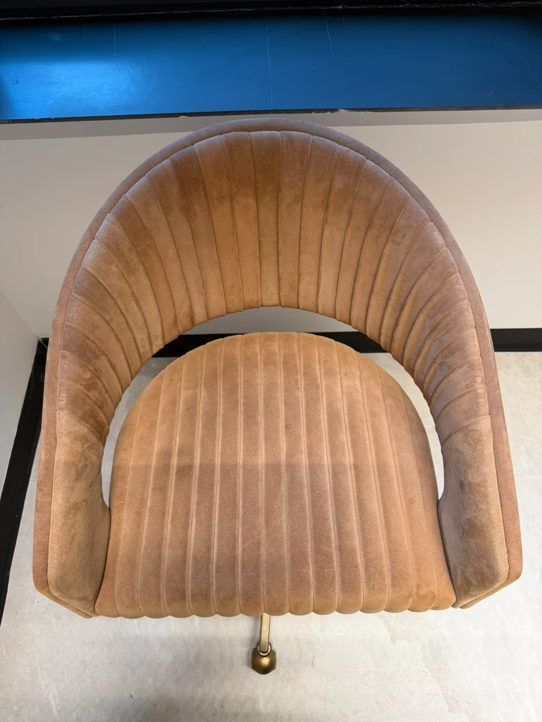 Selling a tan suede swivel desk chair. It's in great condition and would be a stylish addition to any home office or workspace! The chair features a comfortable, curved back and a plush seat, perfect for long hours of work or study. The brushed brass base adds a touch of elegance, and the swivel function allows for easy movement