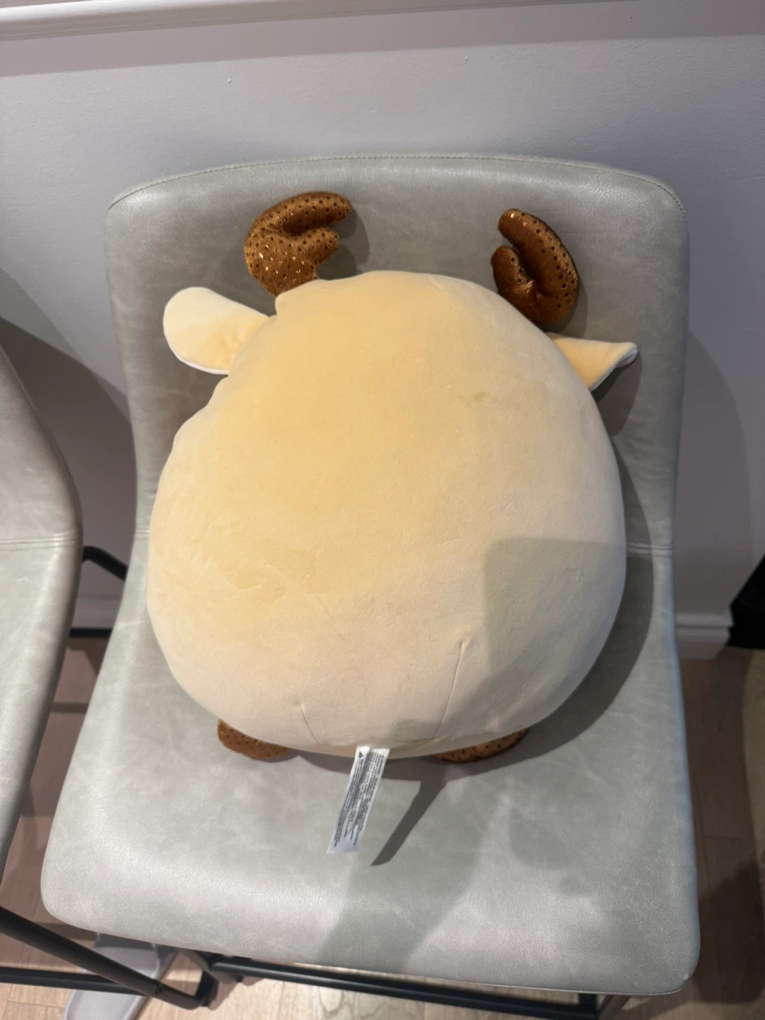This adorable Squishmallow is designed to look like a reindeer holding a pack of Reese's Peanut Butter Trees! It's super soft and huggable, perfect for cuddling or as a cute decoration