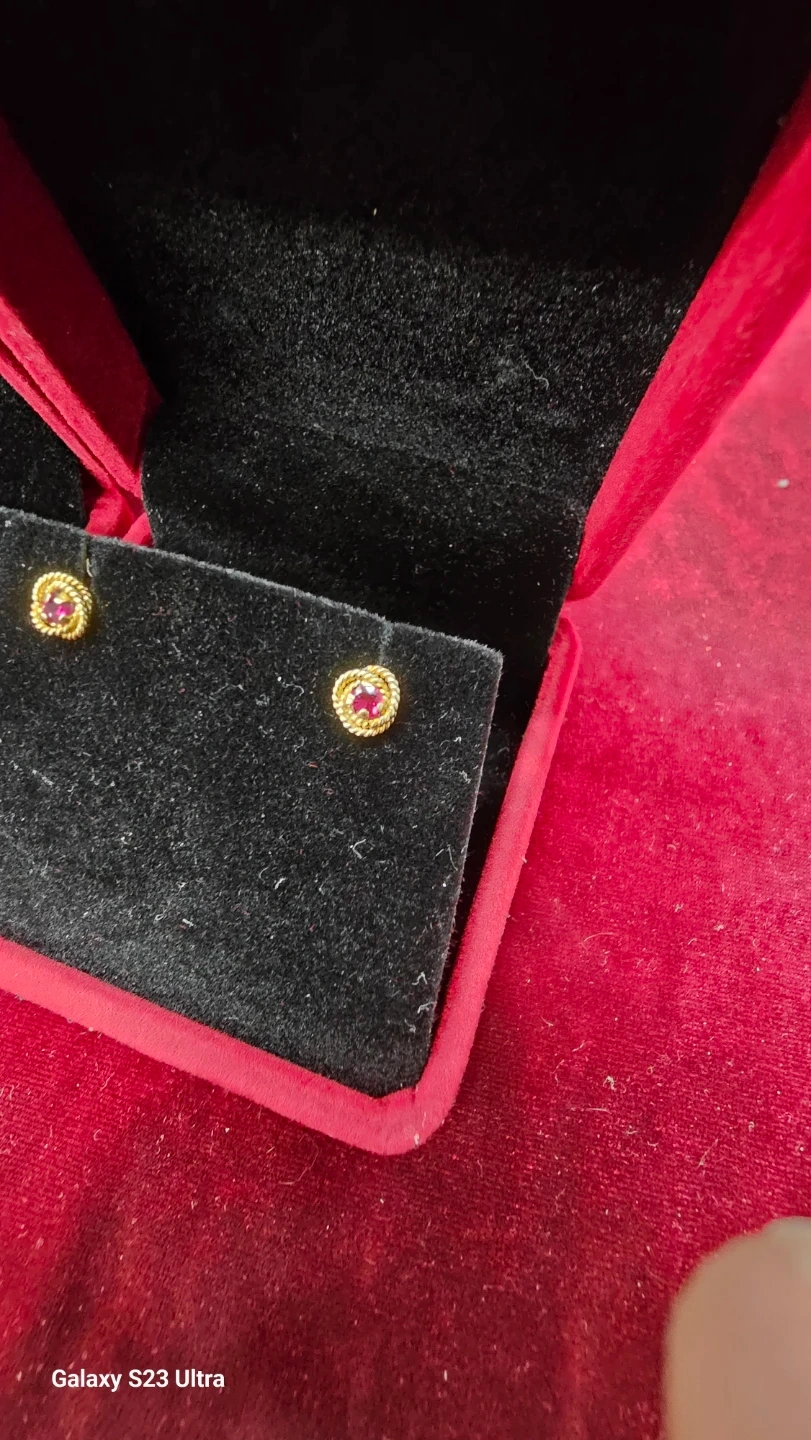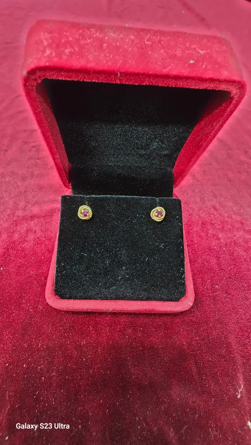 Selling a pair of gold 18k stud earrings, each featuring a small red gemstone. They come in a red velvet box, perfect for gifting or keeping them safe. These earrings would add a touch of elegance to any outfit!