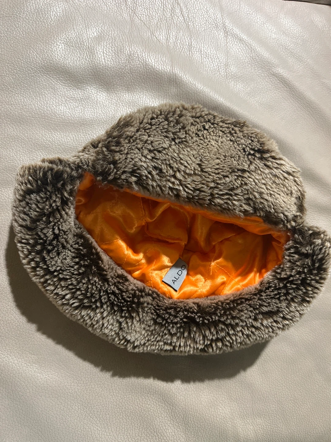 The hat features a soft, faux fur exterior and a vibrant orange lining. Perfect for adding a touch of flair to your winter wardrobe.