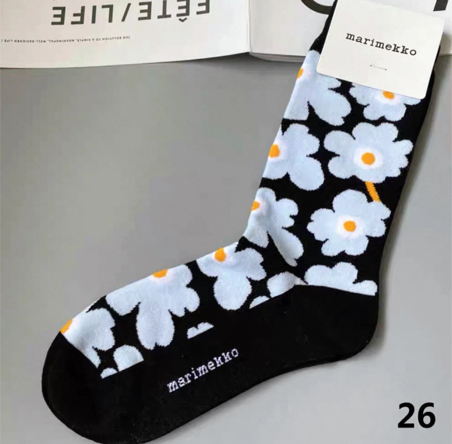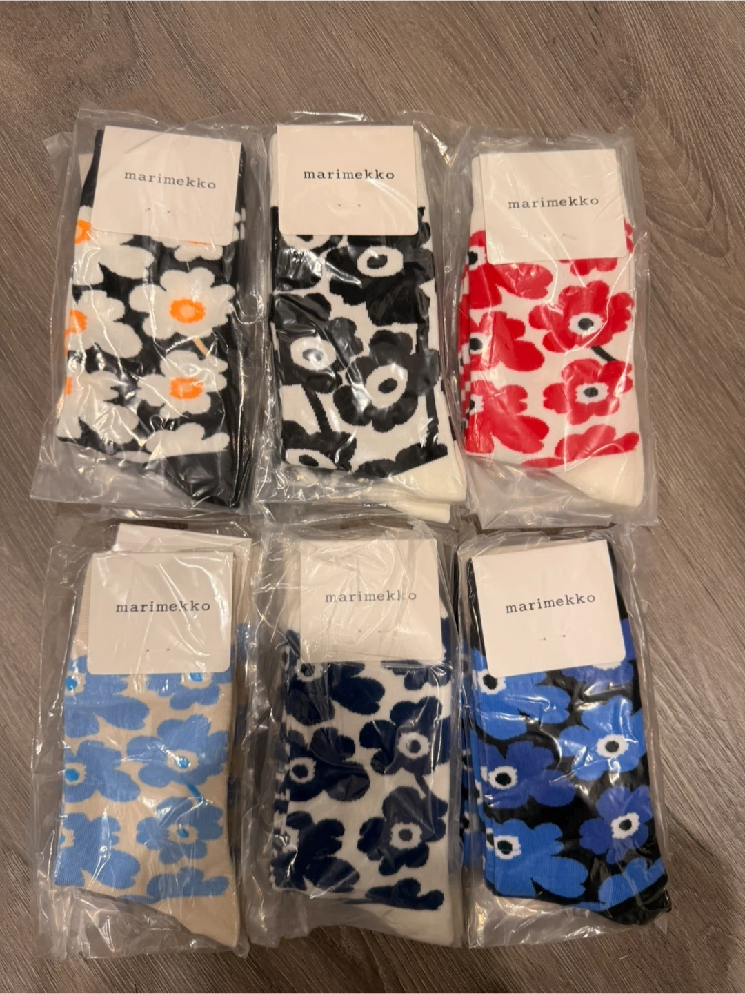 I have some brand new Marimekko socks for sale! They come in a variety of fun and colourful patterns. Perfect for adding a pop of colour to your outfit or as a gift for someone special. They're brand new and still in their original packaging