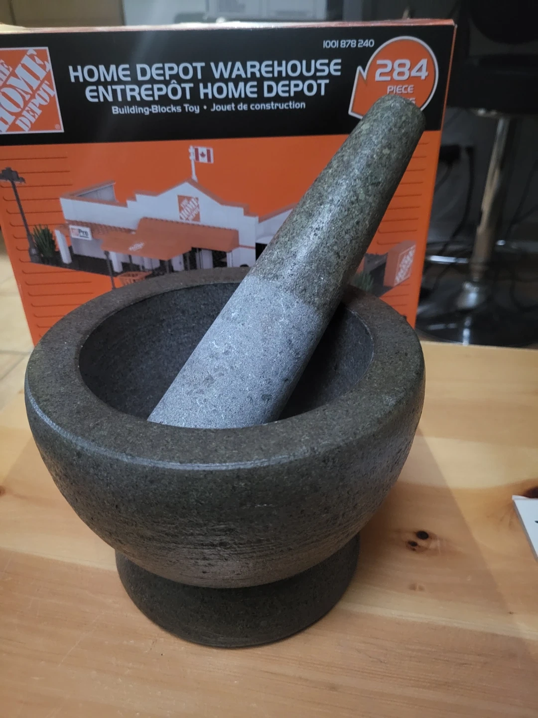 I'm selling a mortar and pestle set. It's in great condition and ready for your kitchen needs! The box in the background will be in a separate ad :)