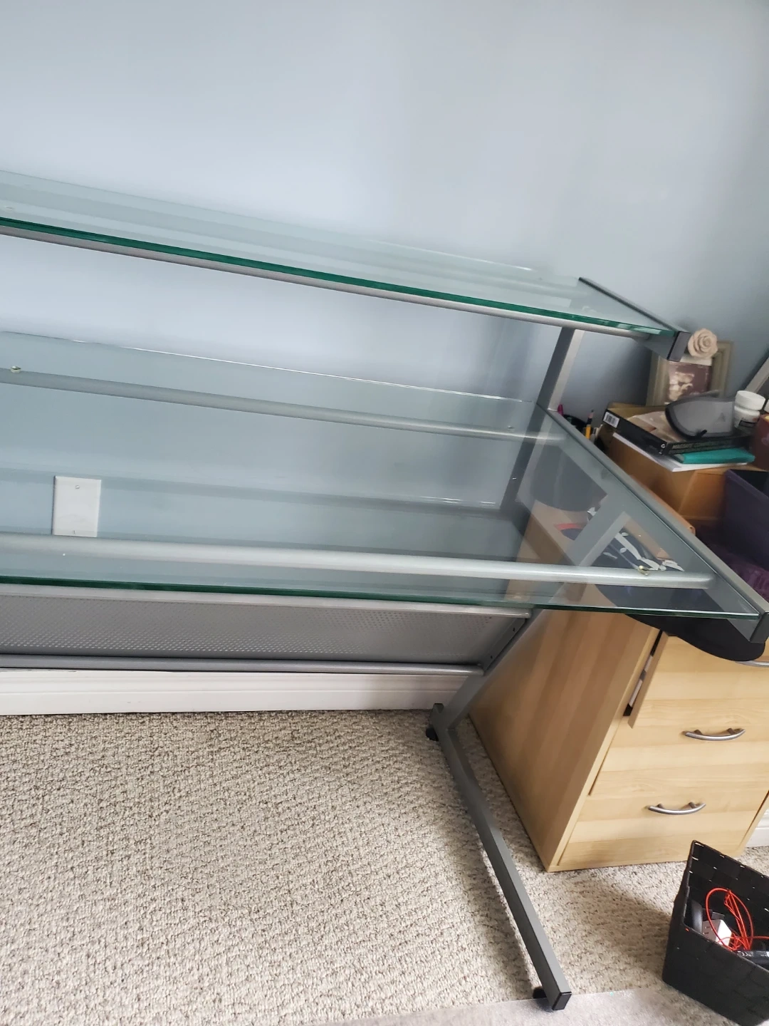 Selling a glass computer desk that comes with shelves. It's in good condition and perfect for a home office setup. The shelves provide extra storage space, which is always handy