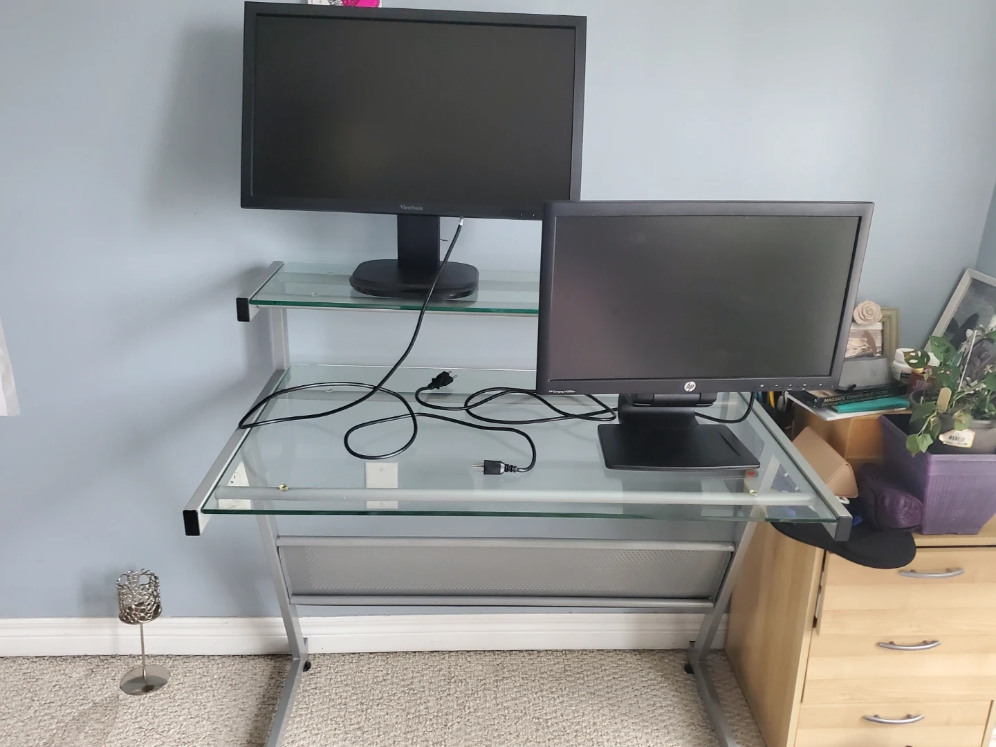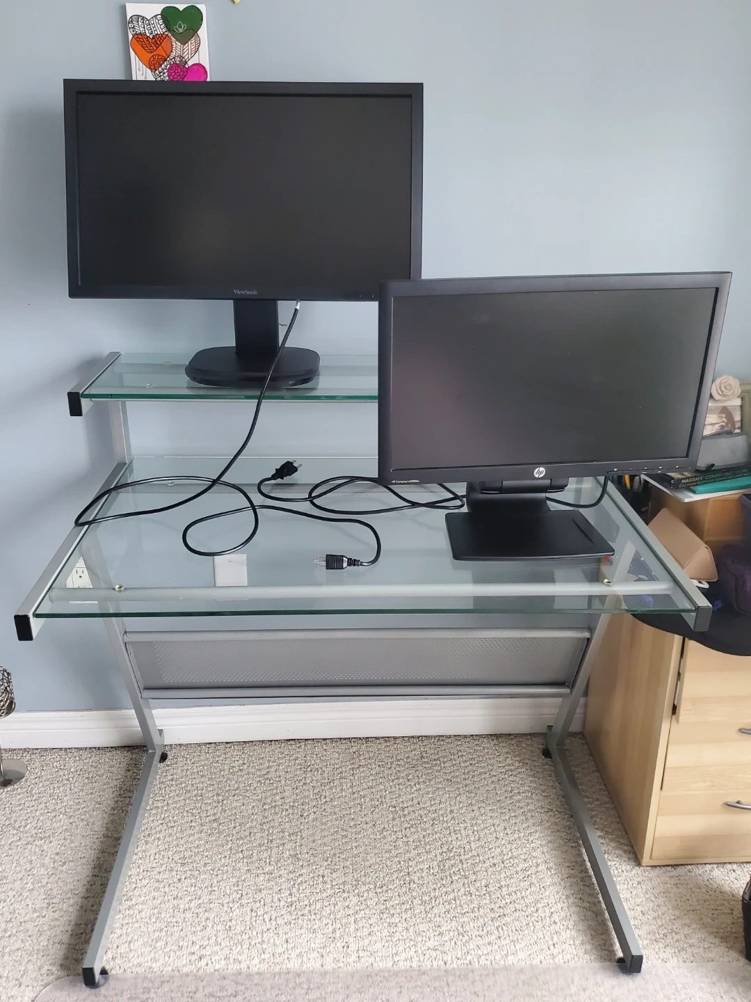Selling a glass computer desk that comes with shelves. It's in good condition and perfect for a home office setup. The shelves provide extra storage space, which is always handy