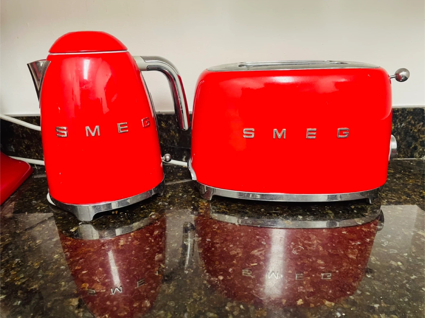Selling a vibrant red Smeg kettle and toaster set! These stylish appliances will add a pop of color to your kitchen. Both are in great condition and ready for a new home