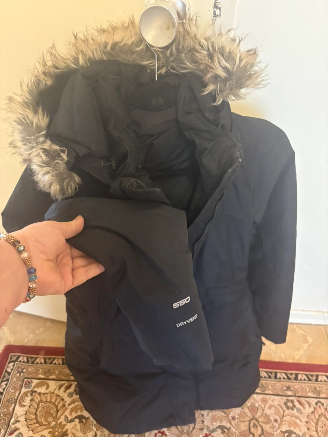 Selling a black The North Face parka in size small. It's in great condition and ready to keep you warm this winter! Features a fur-trimmed hood and a 550 fill power for extra insulation