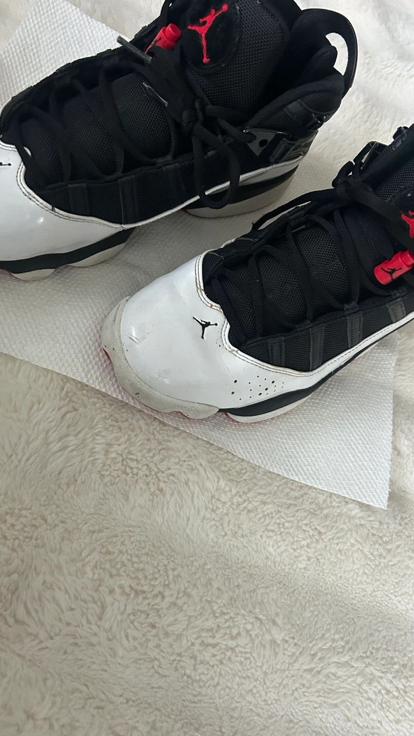 Selling a pair of Jordan 6 Rings basketball shoes. They are black and white with red accents. There are some signs of wear, as shown in the photos, but they are still in good condition for playing ball or casual wear