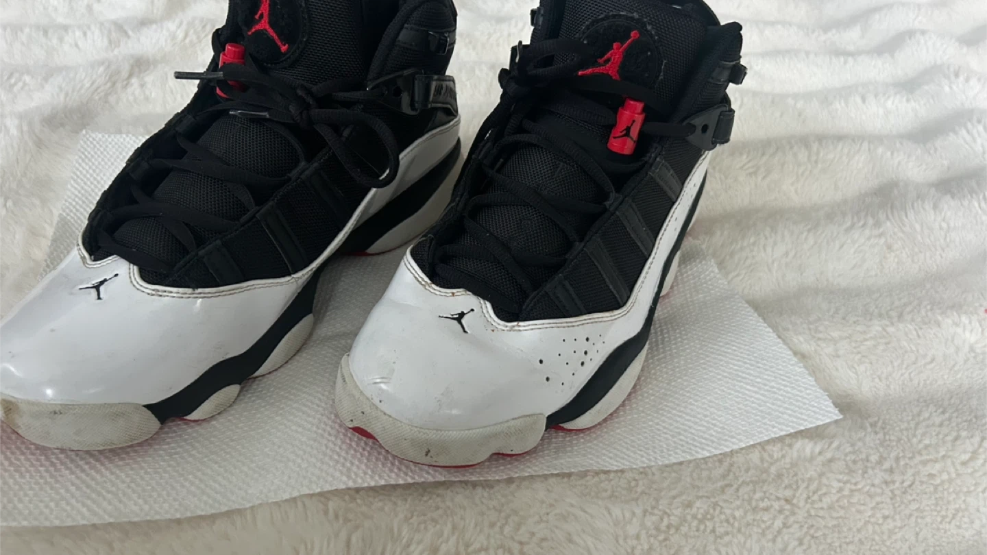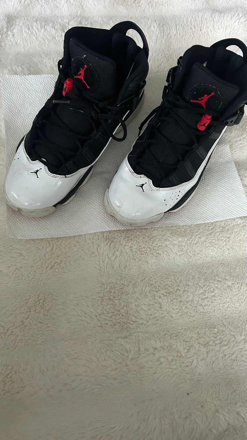 Selling a pair of Jordan 6 Rings basketball shoes. They are black and white with red accents. There are some signs of wear, as shown in the photos, but they are still in good condition for playing ball or casual wear