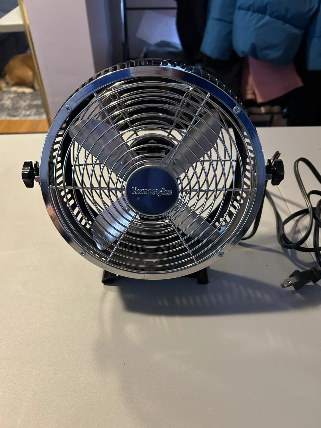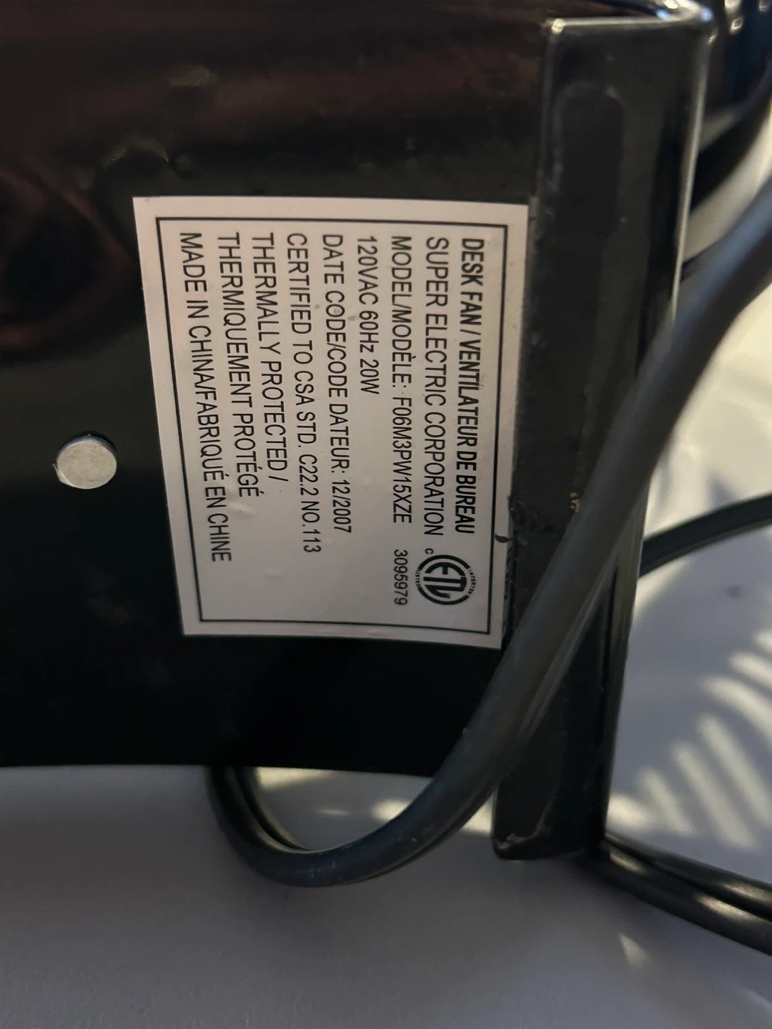 Selling a Homestyles desk fan made by Super Electric Corporation. The model is F06M3PW15ZE. It's a 120VAC, 60Hz, 20W fan.