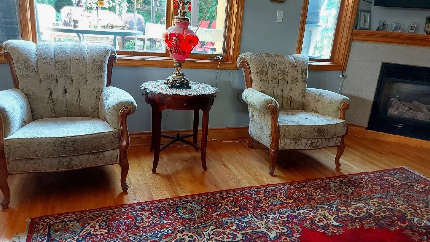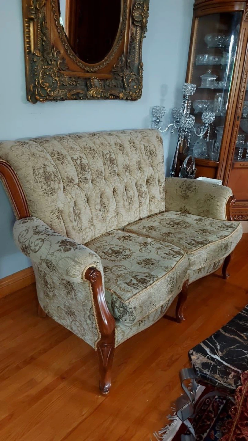 Selling two beautiful vintage armchairs and loveseat set. The set features a unique floral pattern and classic design. Perfect for adding a touch of elegance to your living room!