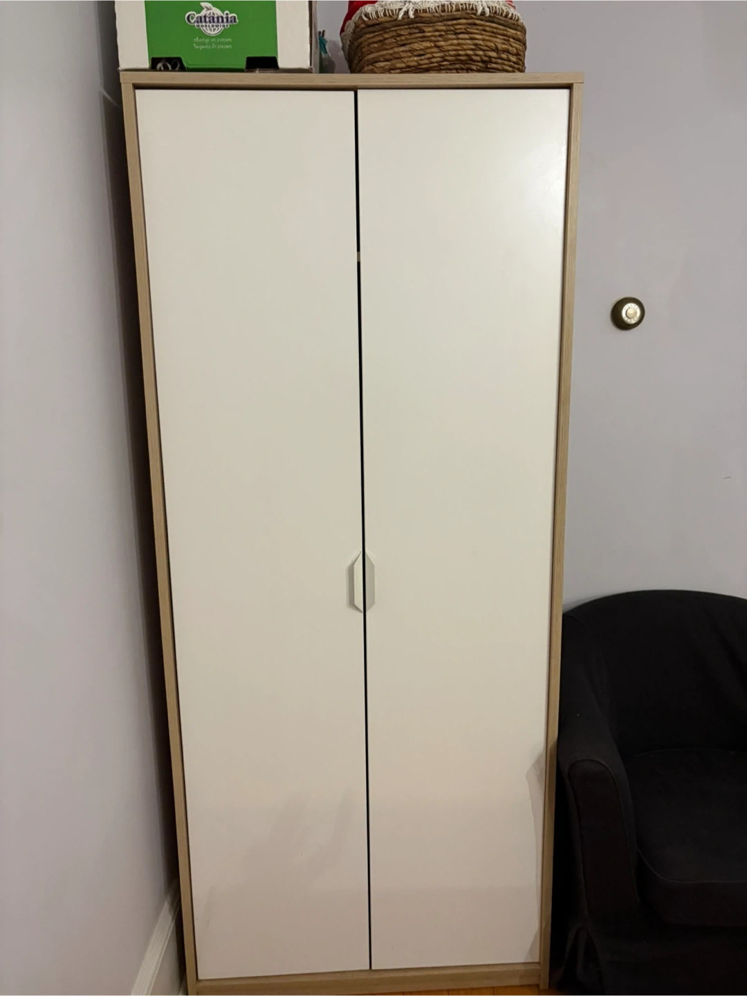 Selling a gently used IKEA PAX wardrobe in a clean white and wood finish.