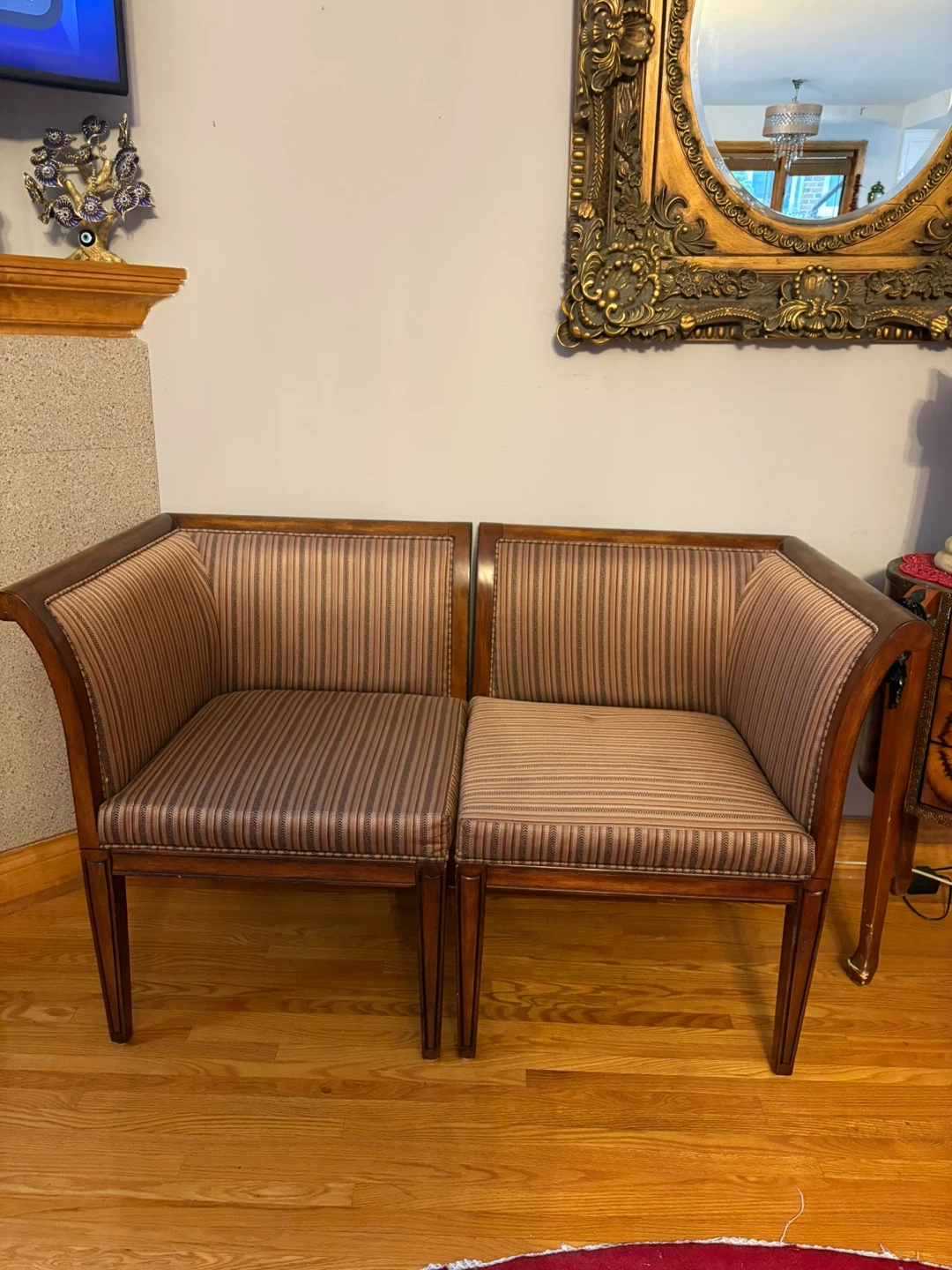 Selling a set of two accent chairs. They feature a striped pattern and a wooden frame. Perfect for adding a touch of elegance to any room!