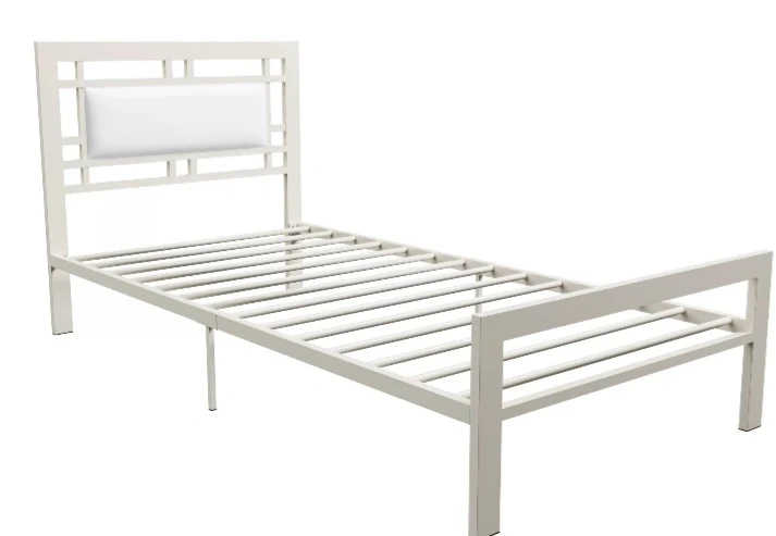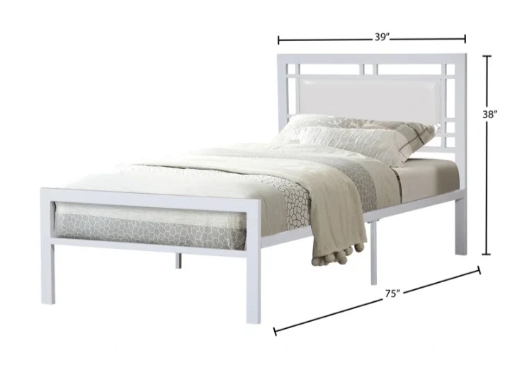 Here's a white metal twin bed frame, perfect for a small bedroom or guest room! The headboard features a unique design with a white padded section.