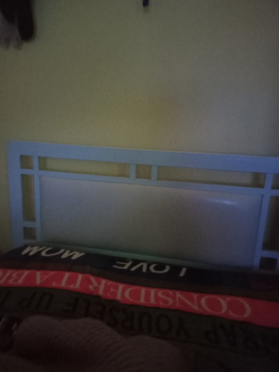 Here's a white metal twin bed frame, perfect for a small bedroom or guest room! The headboard features a unique design with a white padded section.