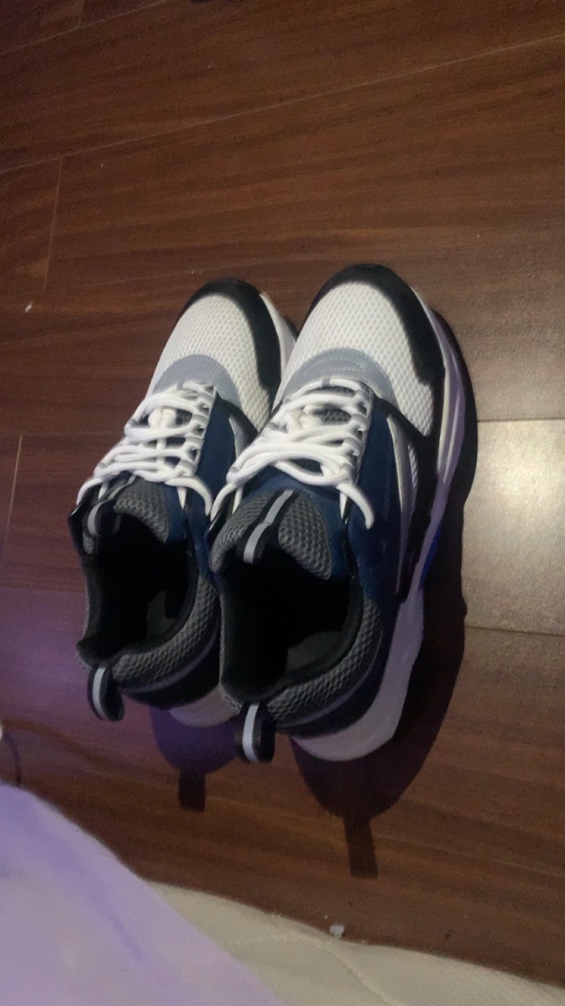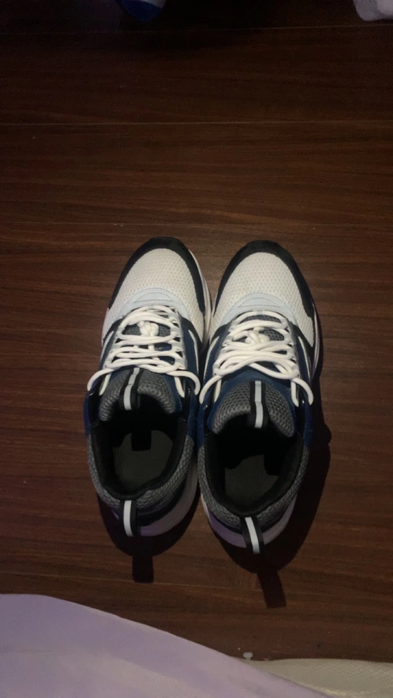 Selling a pair of sneakers in good condition. They feature a white and navy blue colour scheme with reflective detailing. Great for everyday wear gives height boost