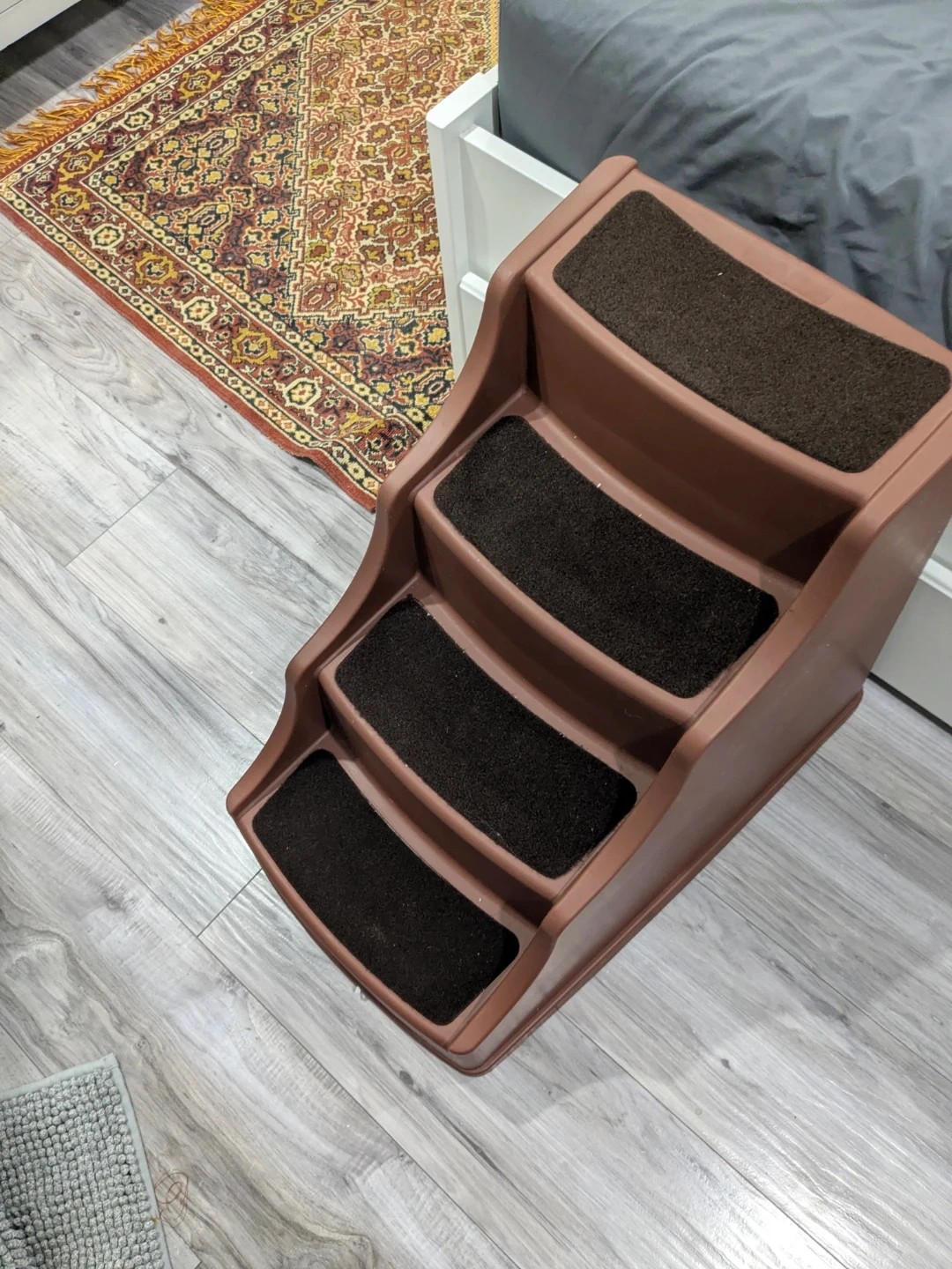 Here are some pet stairs in great condition! They're perfect for helping your furry friends reach higher places like beds or couches. The stairs are brown and have carpeted steps for extra grip and comfort for your pet