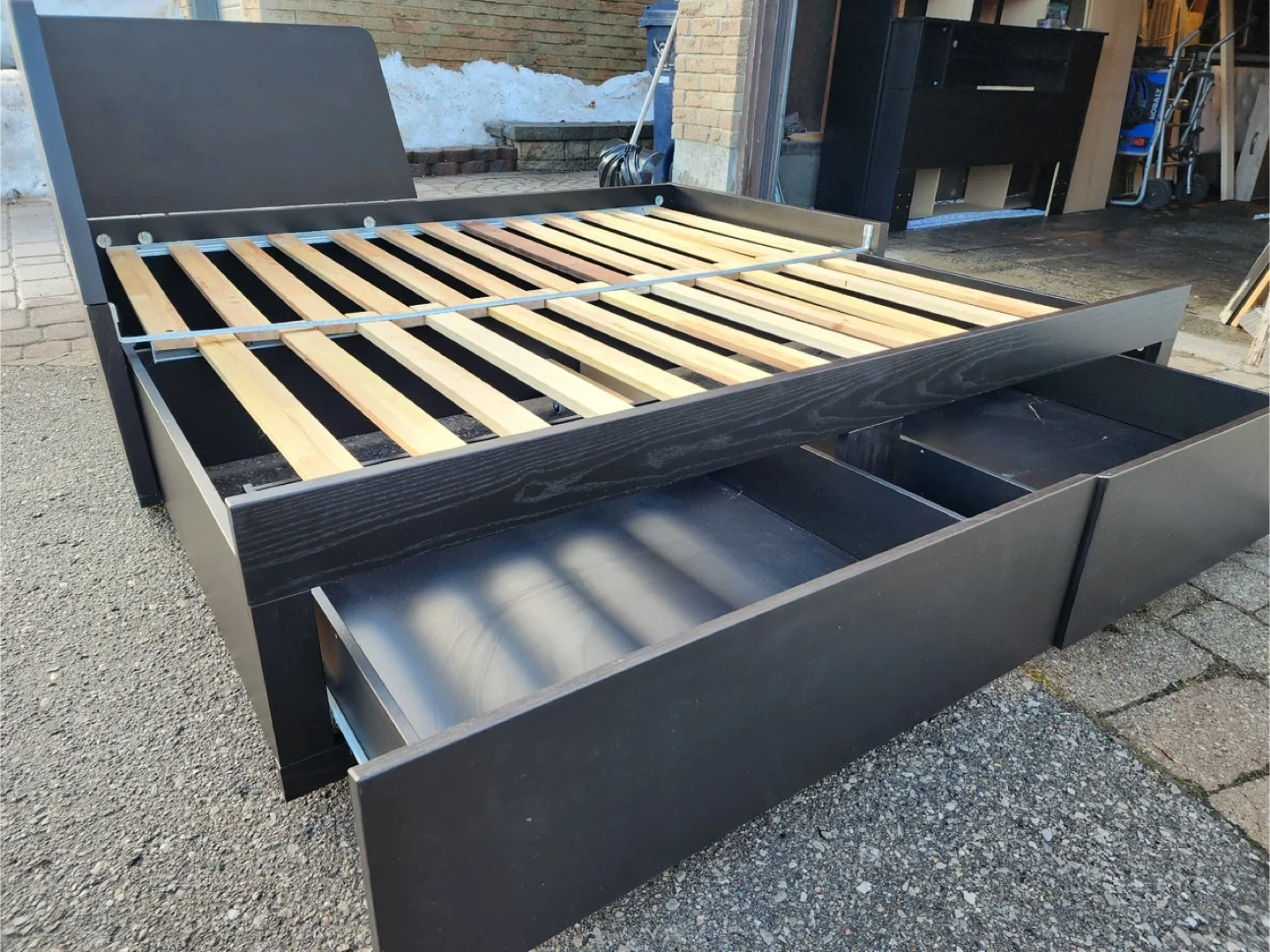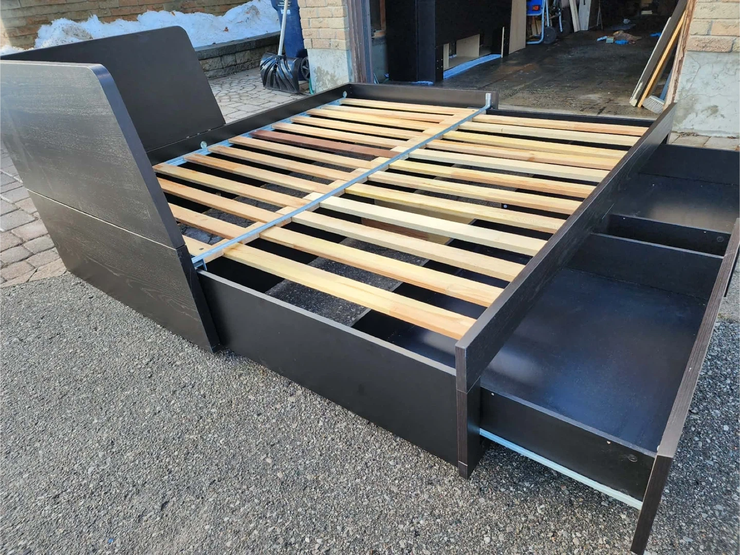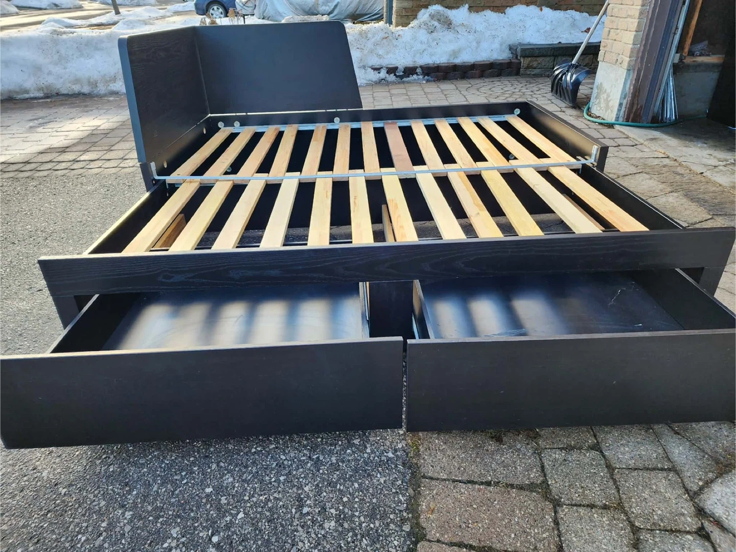 Here's a sturdy bed frame in a dark wood finish! It comes with convenient storage drawers built right in, perfect for maximizing space in your bedroom. The bed frame is in good condition and ready to be used in your home!