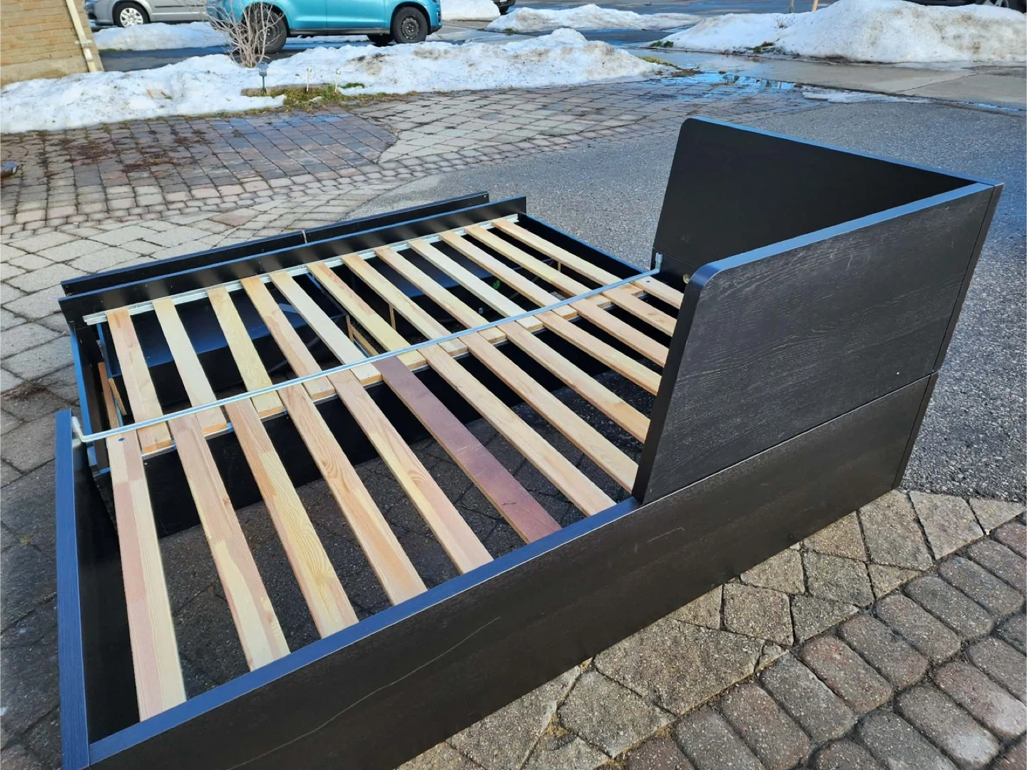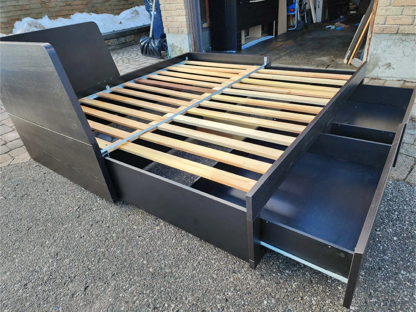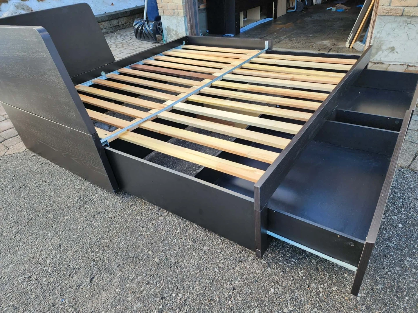 Here's a sturdy bed frame in a dark wood finish! It comes with convenient storage drawers built right in, perfect for maximizing space in your bedroom. The bed frame is in good condition and ready to be used in your home!