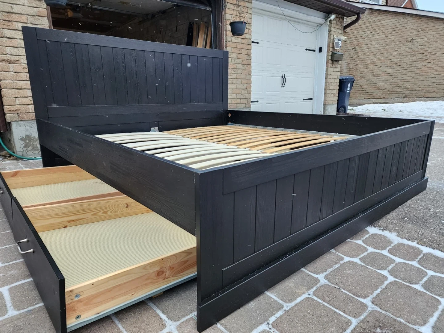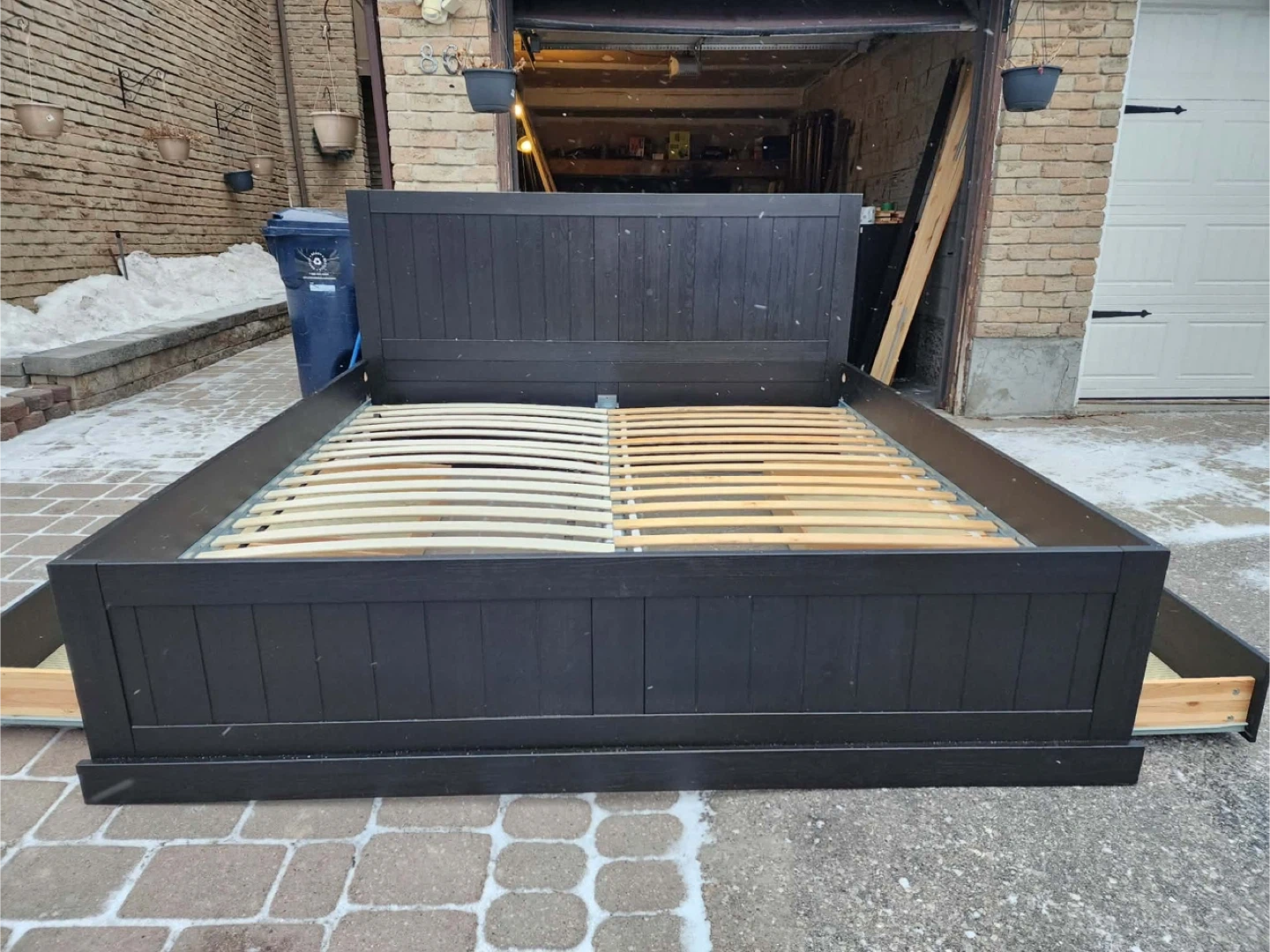 Selling a black wooden king size bed frame. It's in great condition and ready for a new home. Has four drawers for extra storage