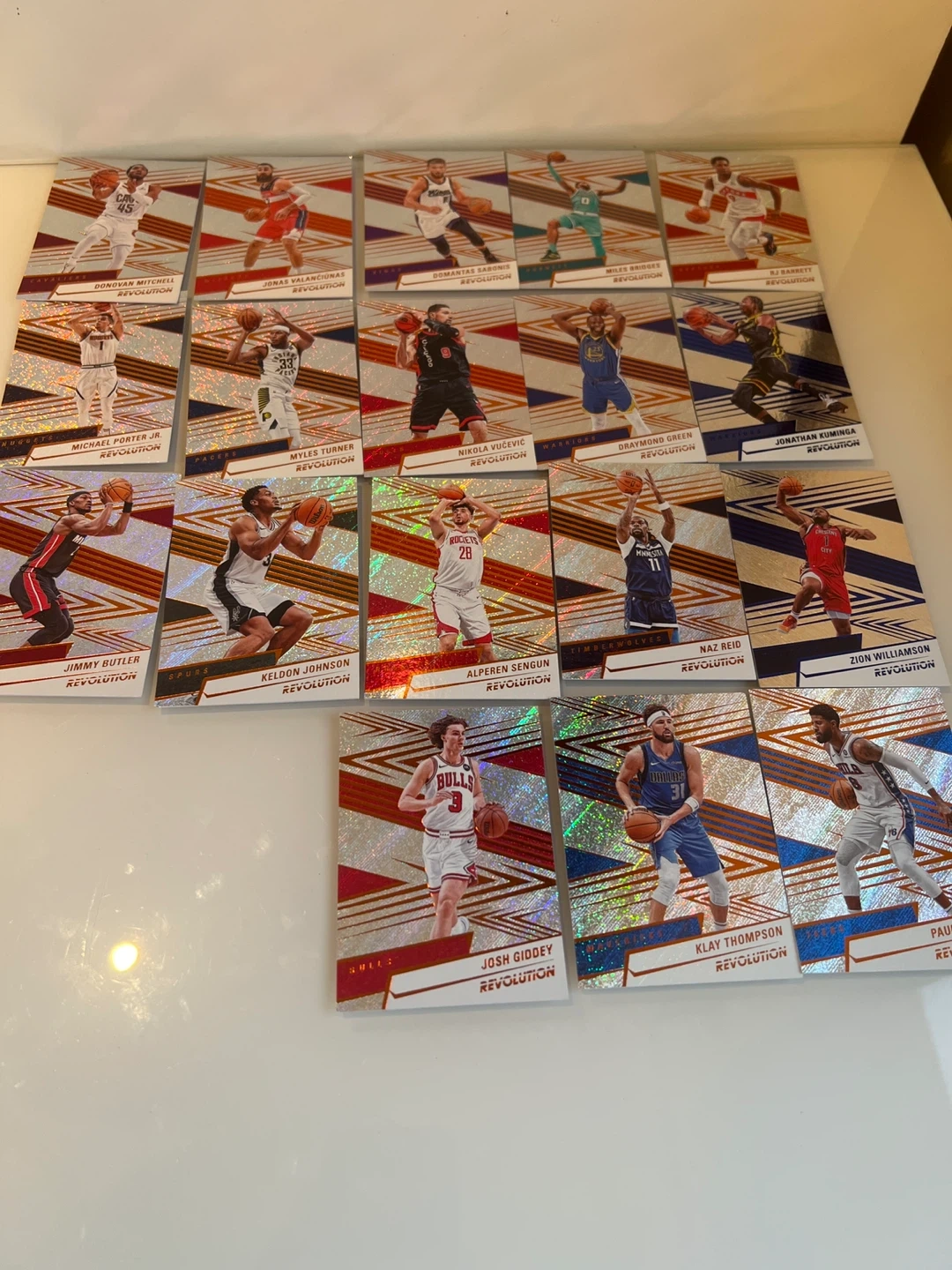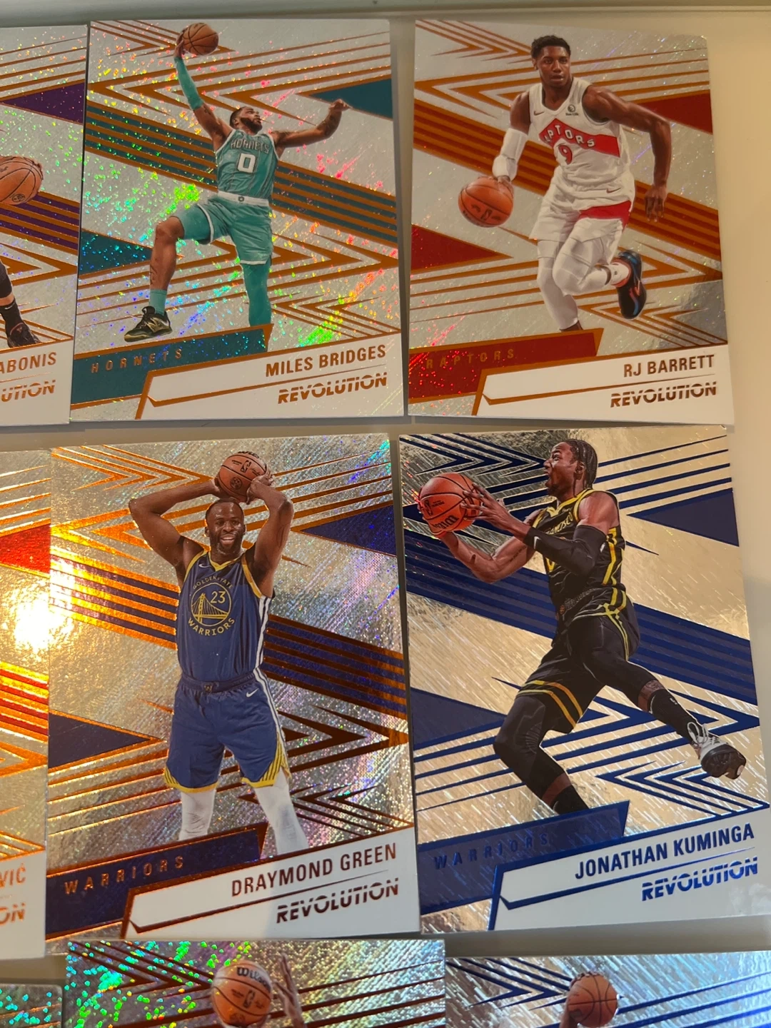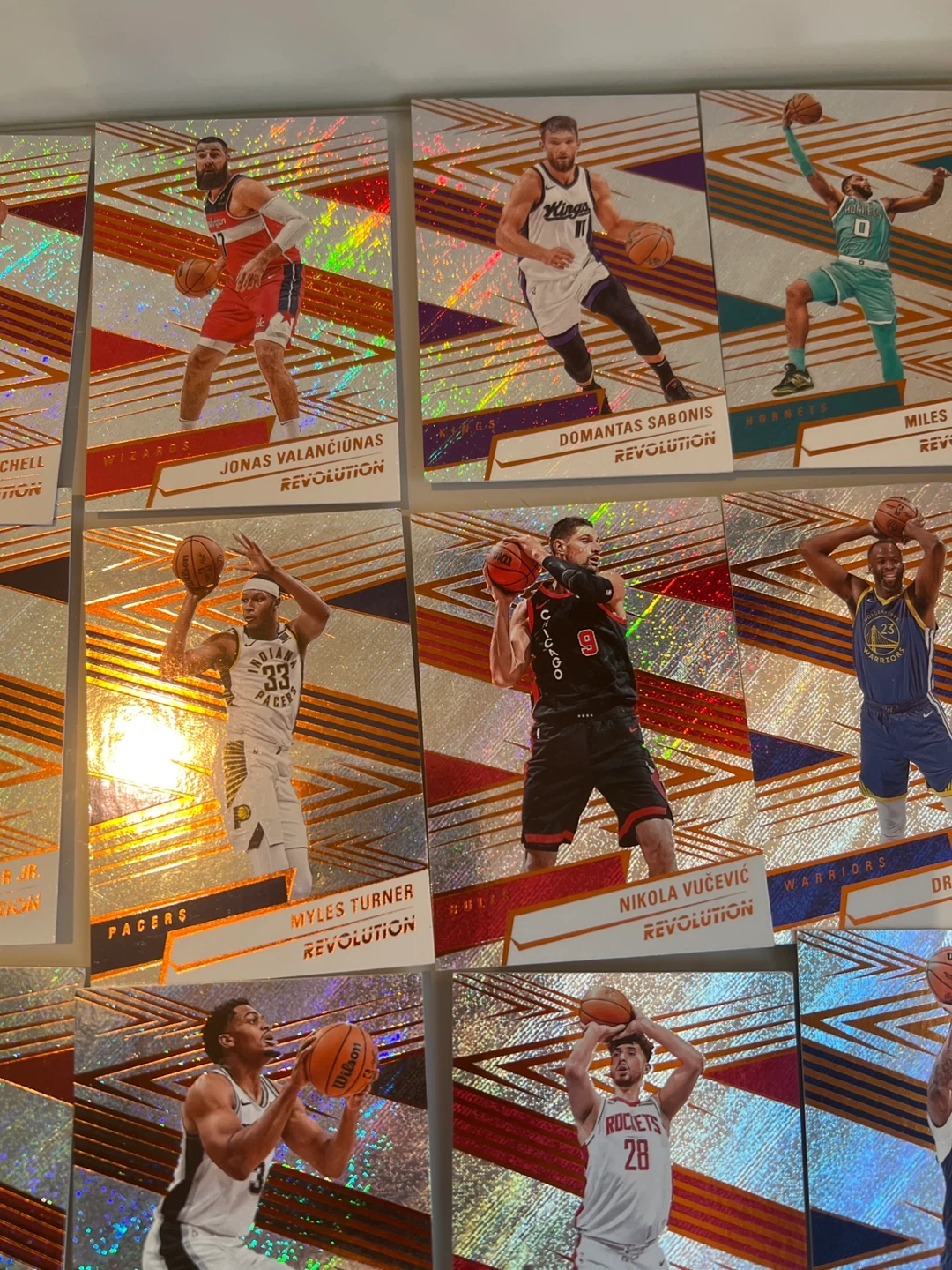 Selling a collection of Panini Revolution basketball cards! These cards feature a cool, eye-catching design with a holographic effect. Great for any basketball fan or card collector looking to add some unique pieces to their collection