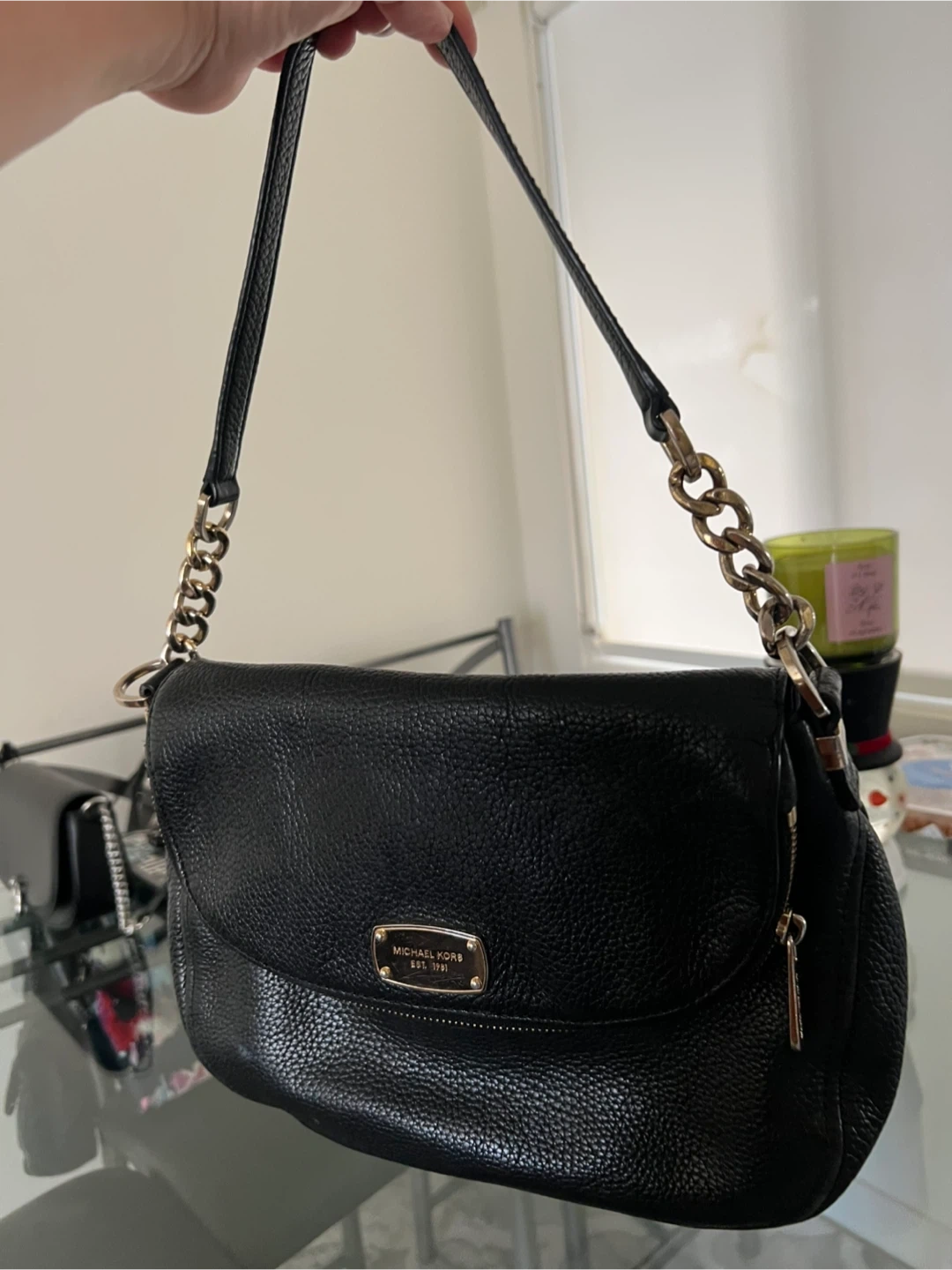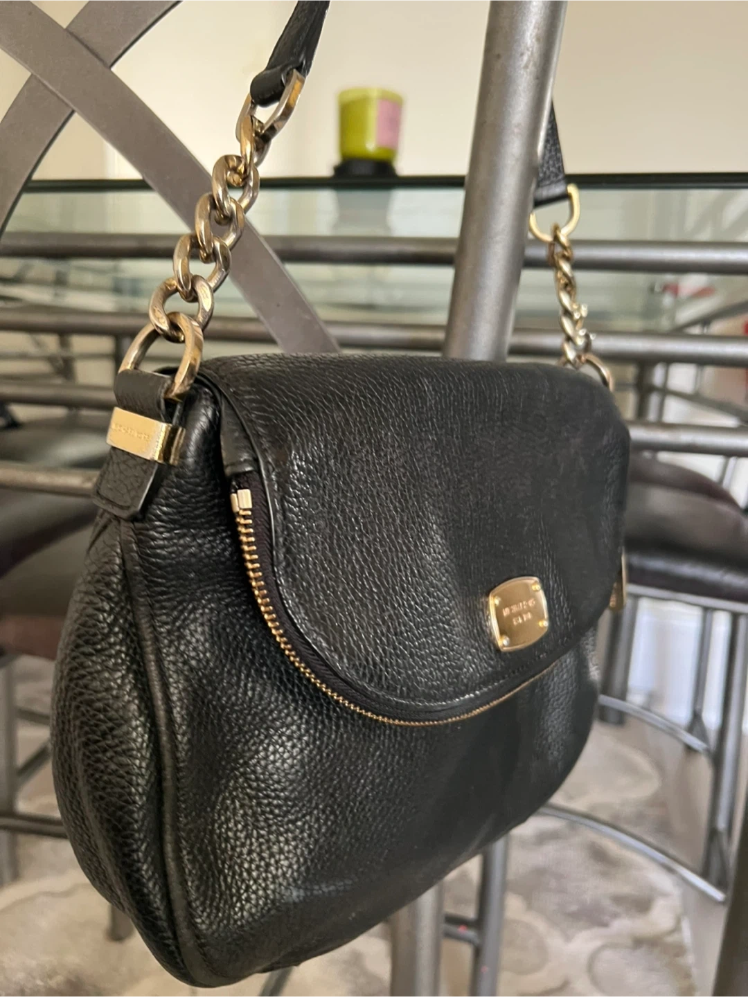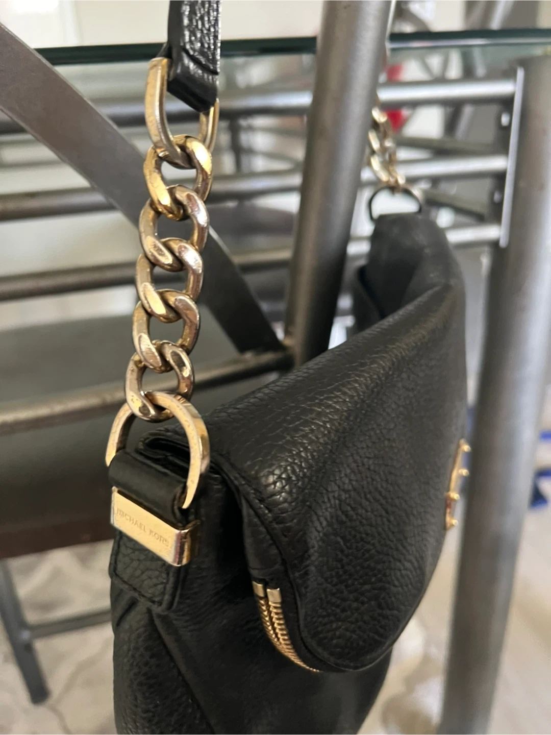Selling a gently used Michael Kors black leather shoulder bag. It features a stylish chain strap and a convenient zip pocket. Perfect for everyday use!