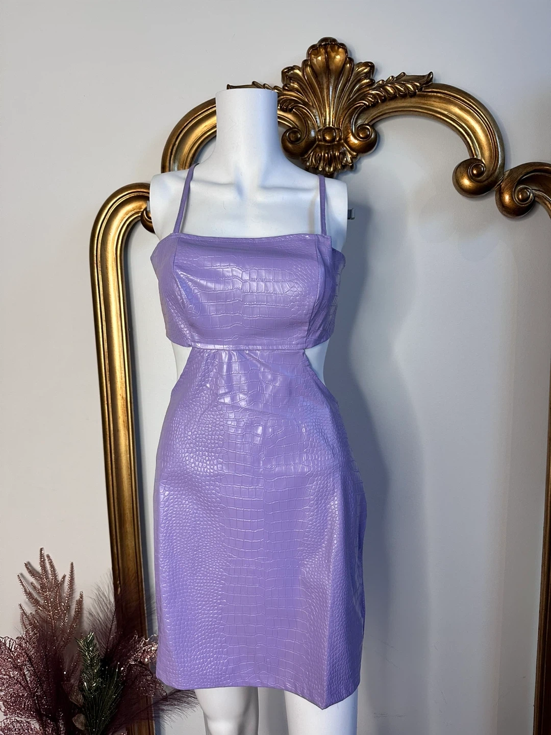 Cute purple mini dress with a croc-embossed pattern! It's a fun and stylish piece to add to your wardrobe. The dress features a square neckline and a fitted silhouette. Perfect for a night out or a special occasion