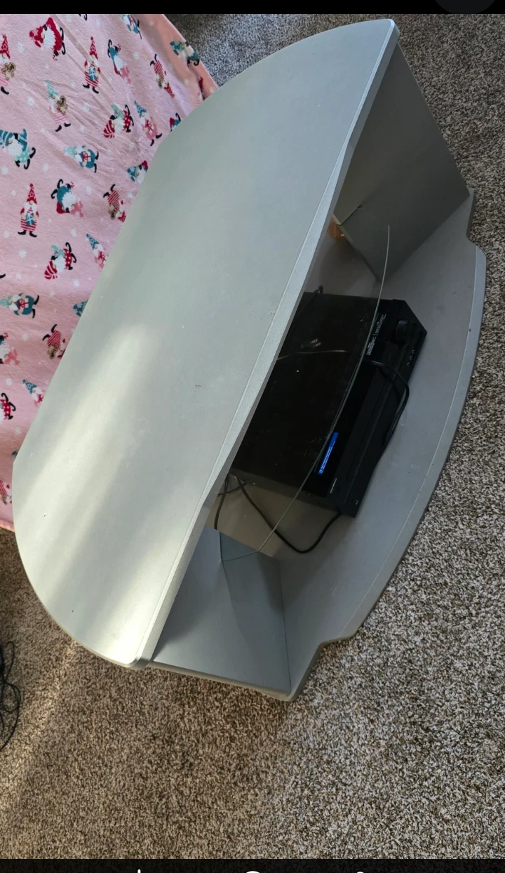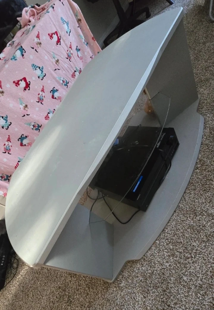 Selling a grey TV stand with a glass shelf. It has a unique, curved design and is in good condition. Perfect for adding a modern touch to your living room setup!