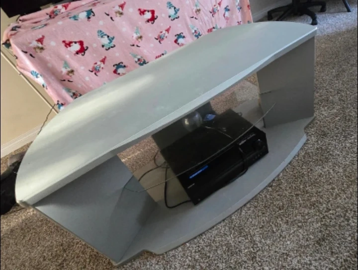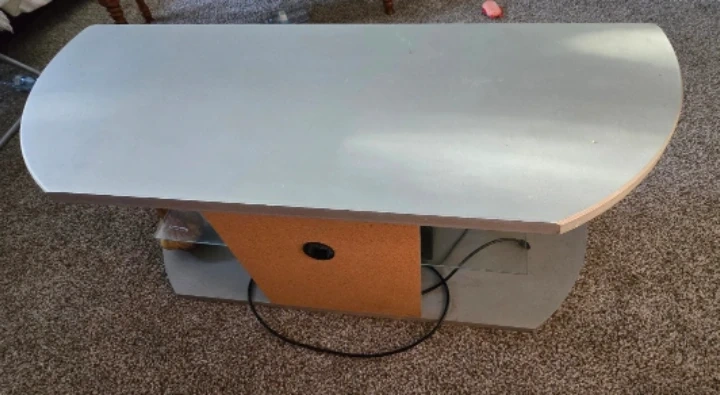 Selling a grey TV stand with a glass shelf. It has a unique, curved design and is in good condition. Perfect for adding a modern touch to your living room setup!