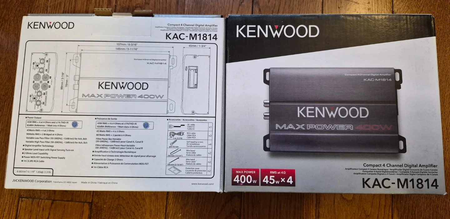 The Kenwood KAC-M1814 4-channel Class D digital amplifier gives your audio system a significant boost in power and clarity. Its compact size makes it easy to install in cars, motorcycles, or boats, while the marine-rated design protects it from moisture and salt. Each channel delivers 45 watts RMS, giving you more than double the power of most factory stereos. This amplifier works with virtually any source, whether you're using RCA cables from an aftermarket receiver or speaker-level inputs from a factory radio. The signal detection feature makes installation even easier. Built with separate boards for the preamp and power stages, it delivers clean, detailed sound. The KAC-M1814 also includes variable high-pass and low-pass filters so you can fine-tune the sound to your setup. With overheat, short-circuit, and overload protection, it's designed for safe and reliable operation. Compact, powerful and versatile, this amplifier is ready to deliver loud, clear sound on the road or on the water.
