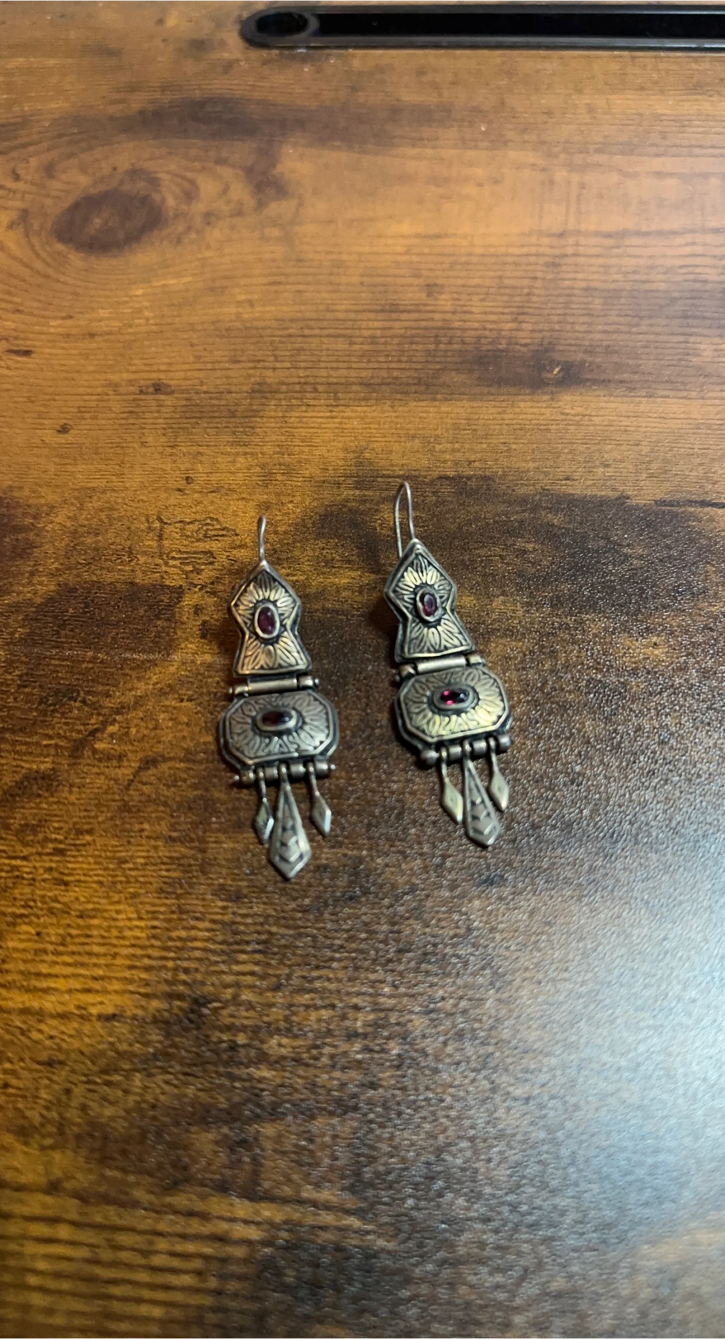 These are vintage sterling silver earrings (marked with 925) and decorated with red stones. I doubt the stones are anything crazy in value, but I know nothing about them. These earrings have been in my husband’s grandmother’s jewelry box for years and we are trying to declutter.