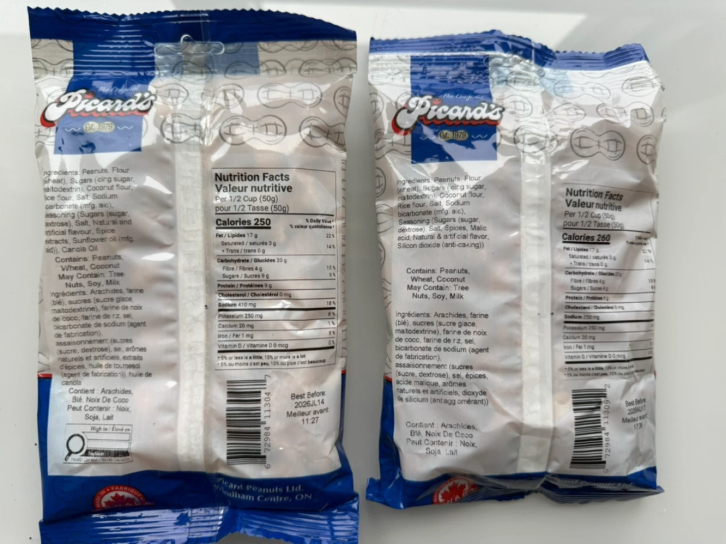 Selling two bags of Picard's Cookie Nuts! One bag is the Sweet & Salty flavour, and the other is Apple Fritter. Both bags are 250g. The Sweet & Salty best before date is 2026 June 14, and the Apple Fritter best before date is 2026 November 27