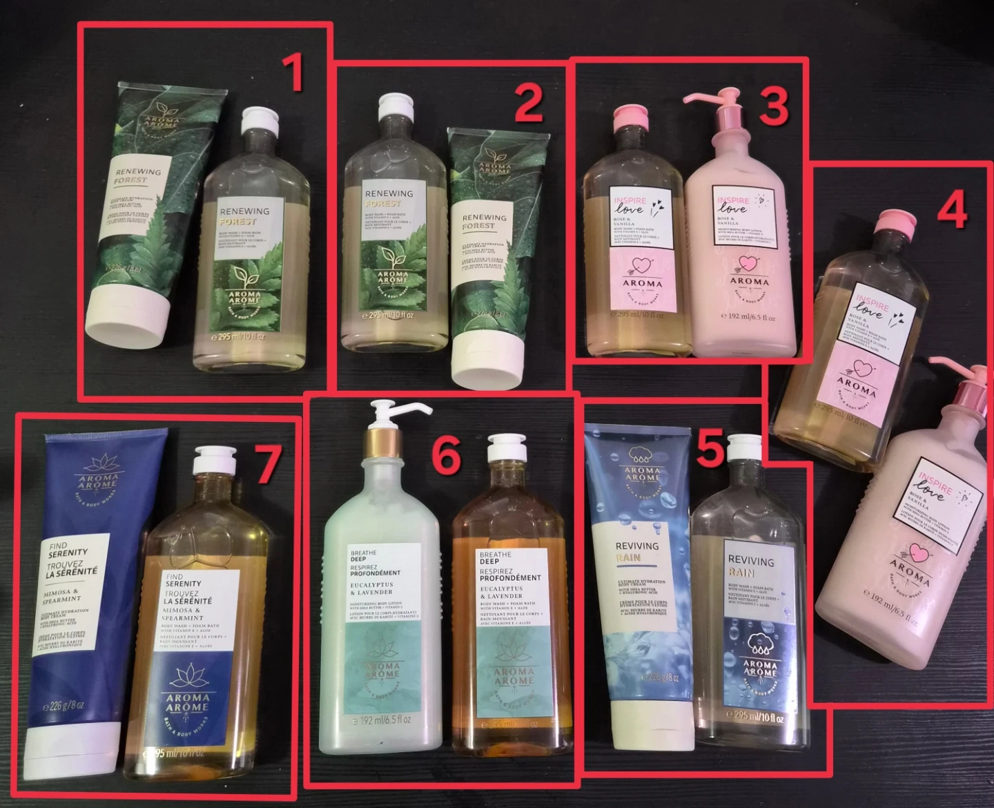 Selling a collection of Aroma Arome bath and body products from Bath & Body Works! Includes a variety of scents and types, such as body wash, and moisturizing body lotion. Perfect for trying out new fragrances or stocking up on your favourites!