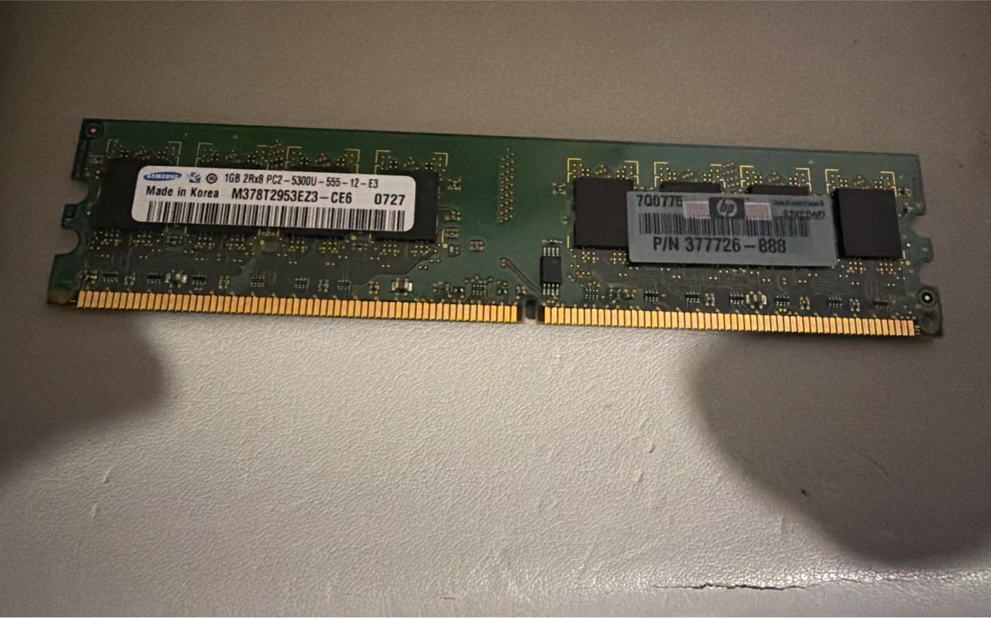 Selling a Samsung 1GB 2Rx8 PC2-5300U-555-12-E3 RAM memory stick. It was made in Korea and has the model number M378T2953EZ3-CE6. Also includes an HP RAM memory stick.