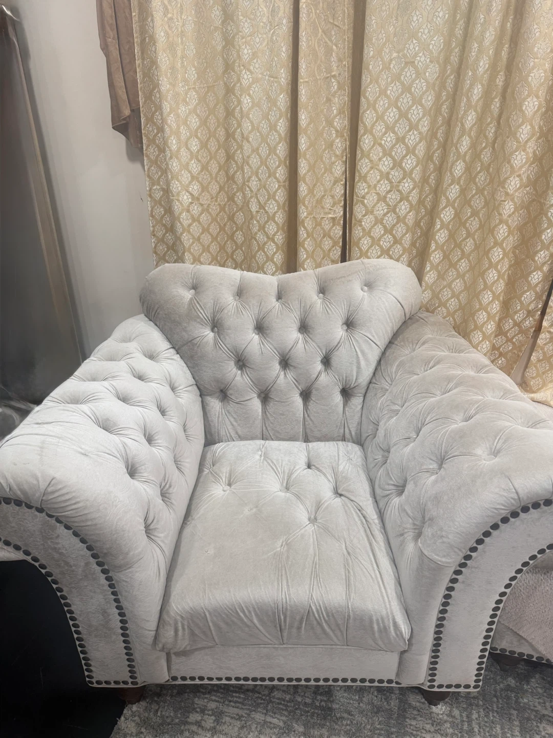 Selling a tufted ottoman and loveseat set. The set is a light neutral color. The ottoman is square and the loveseat is in good condition. Perfect for a living room or den