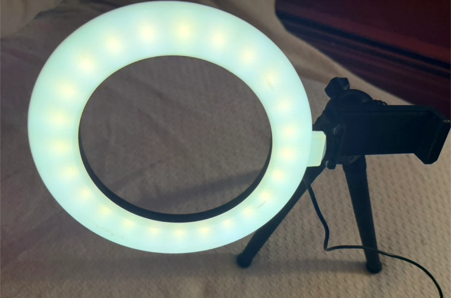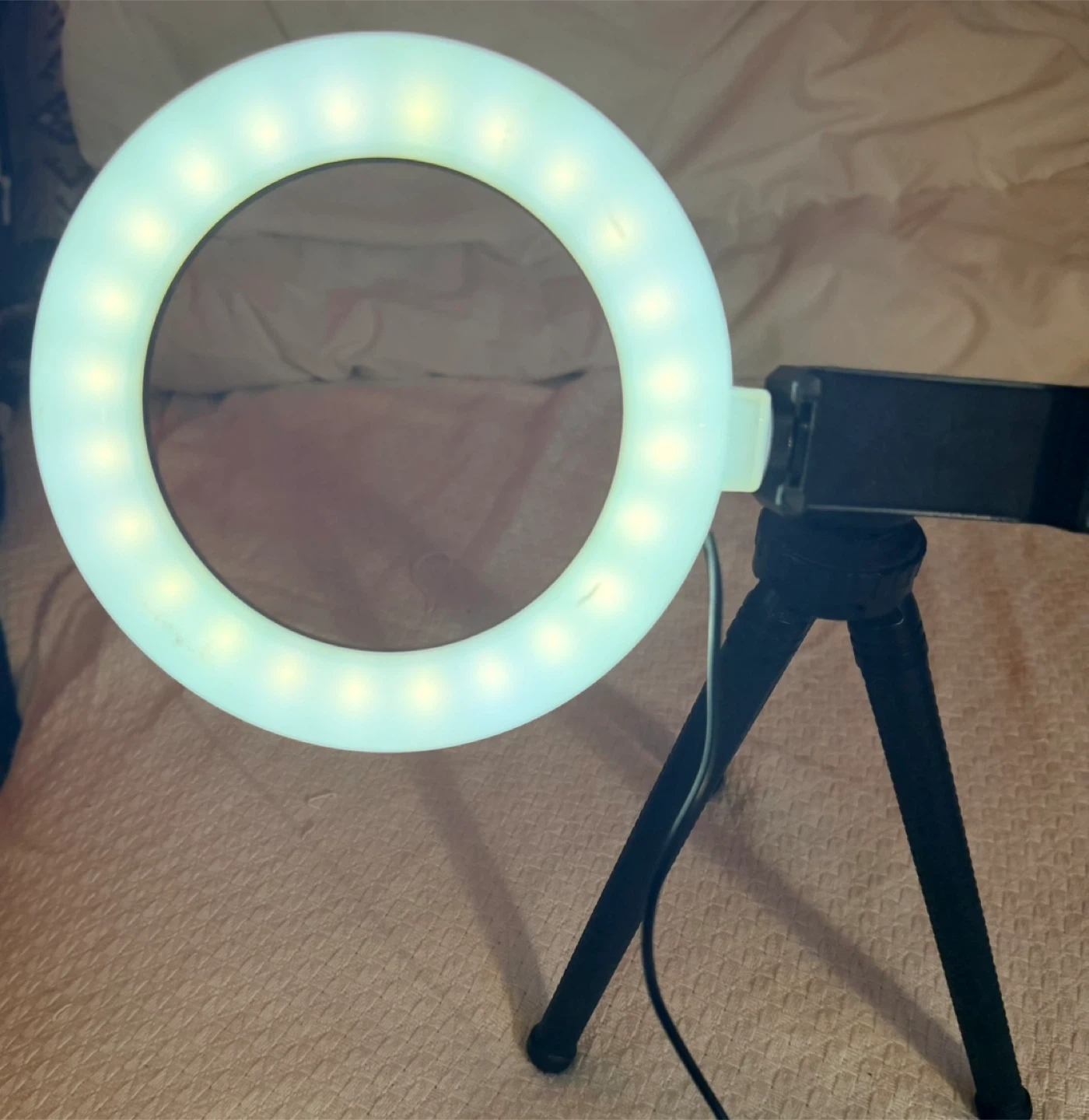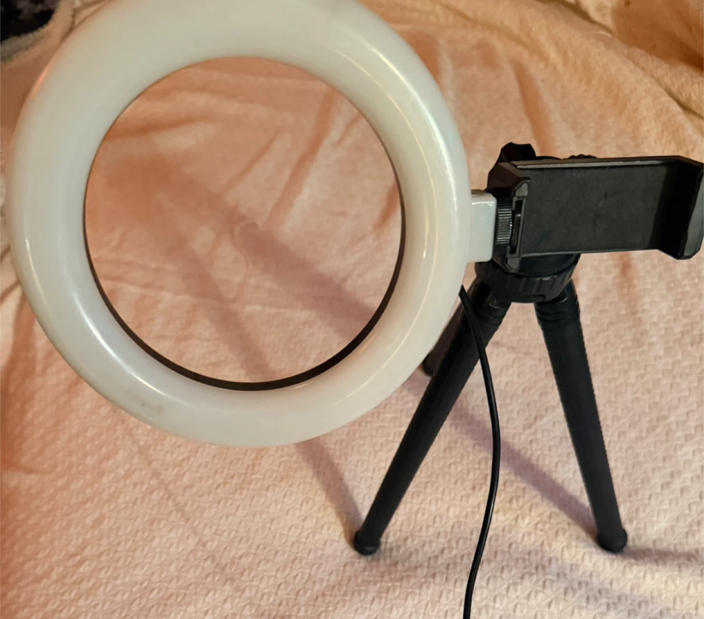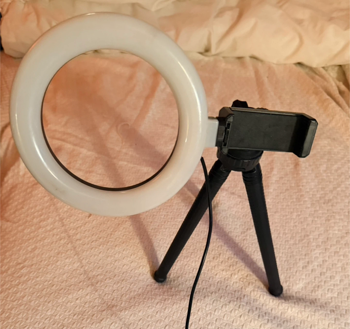Selling a ring light that comes with a tripod and phone holder. It's perfect for taking photos or videos! The ring light is white and has adjustable brightness settings.