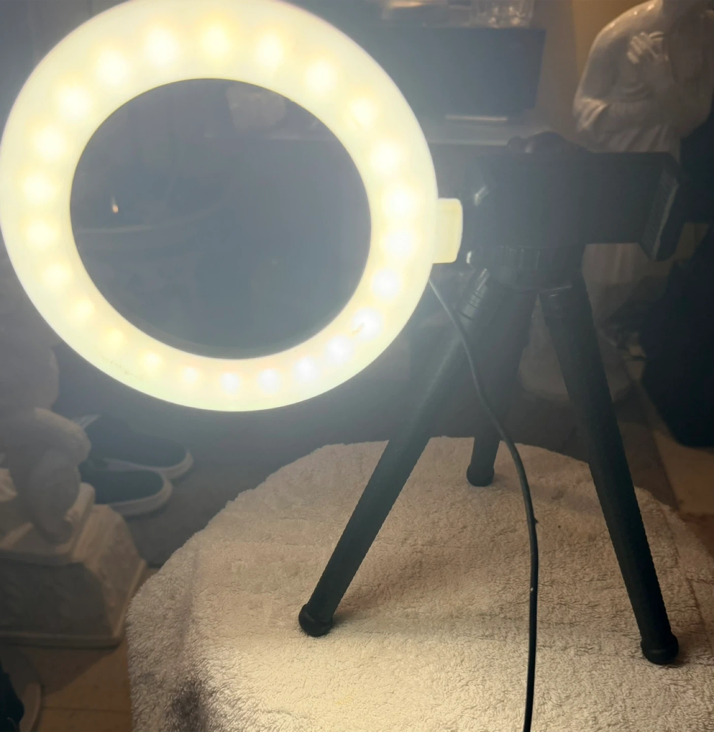 Selling a ring light that comes with a tripod and phone holder. It's perfect for taking photos or videos! The ring light is white and has adjustable brightness settings.