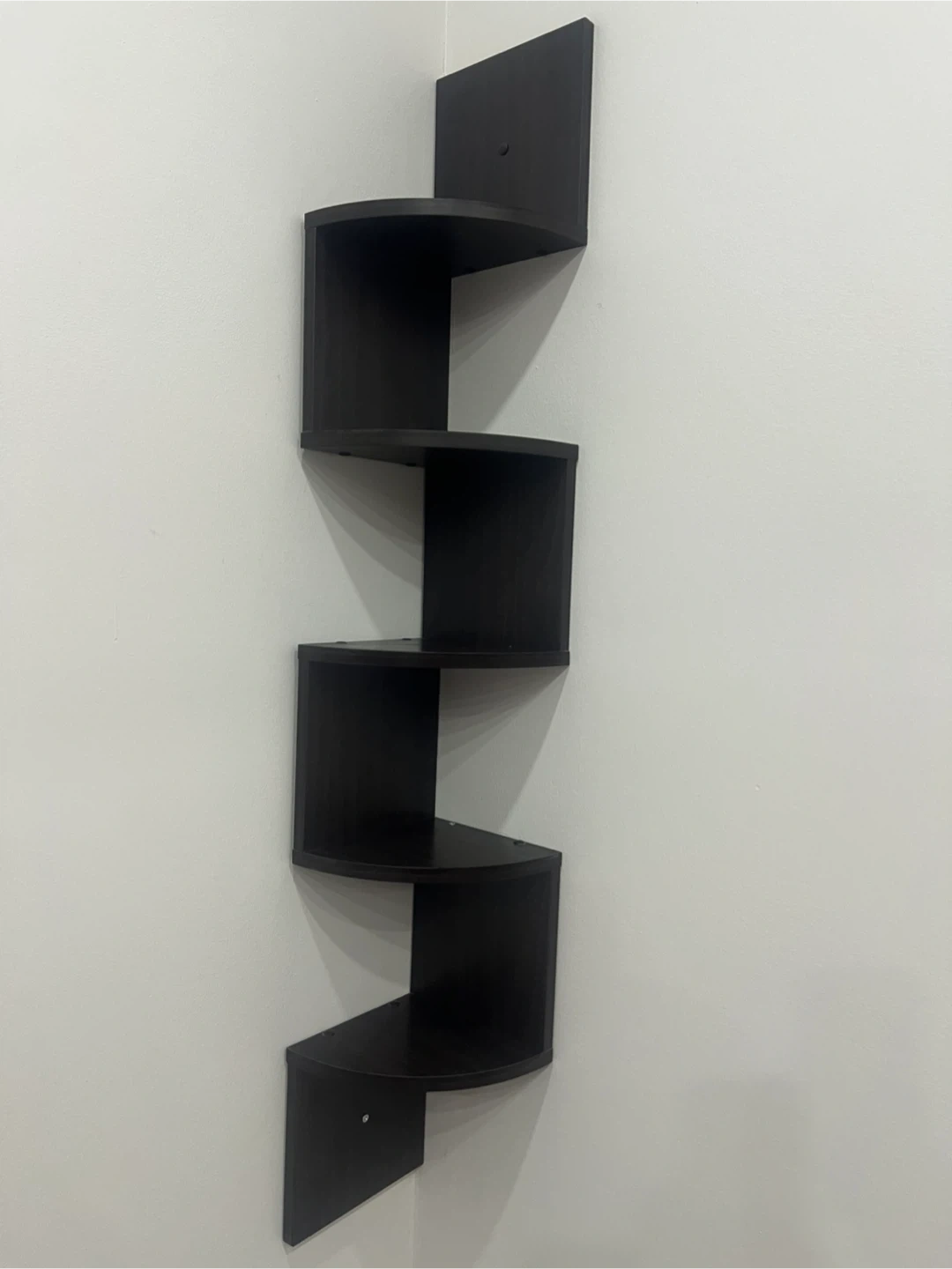 Add a touch of elegance to any room with this sleek, dark brown, 5-tier corner shelf, perfect for displaying your favourite photos, or decorative items. This used shelf is in good condition and ready to bring stylish storage to your home.