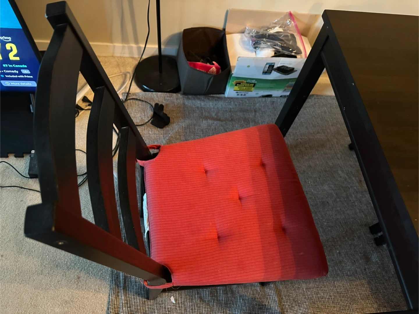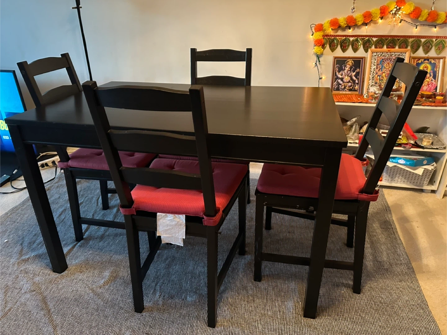 Selling a dining table with four chairs! The table is a dark colour and comes with four chairs with red cushions.