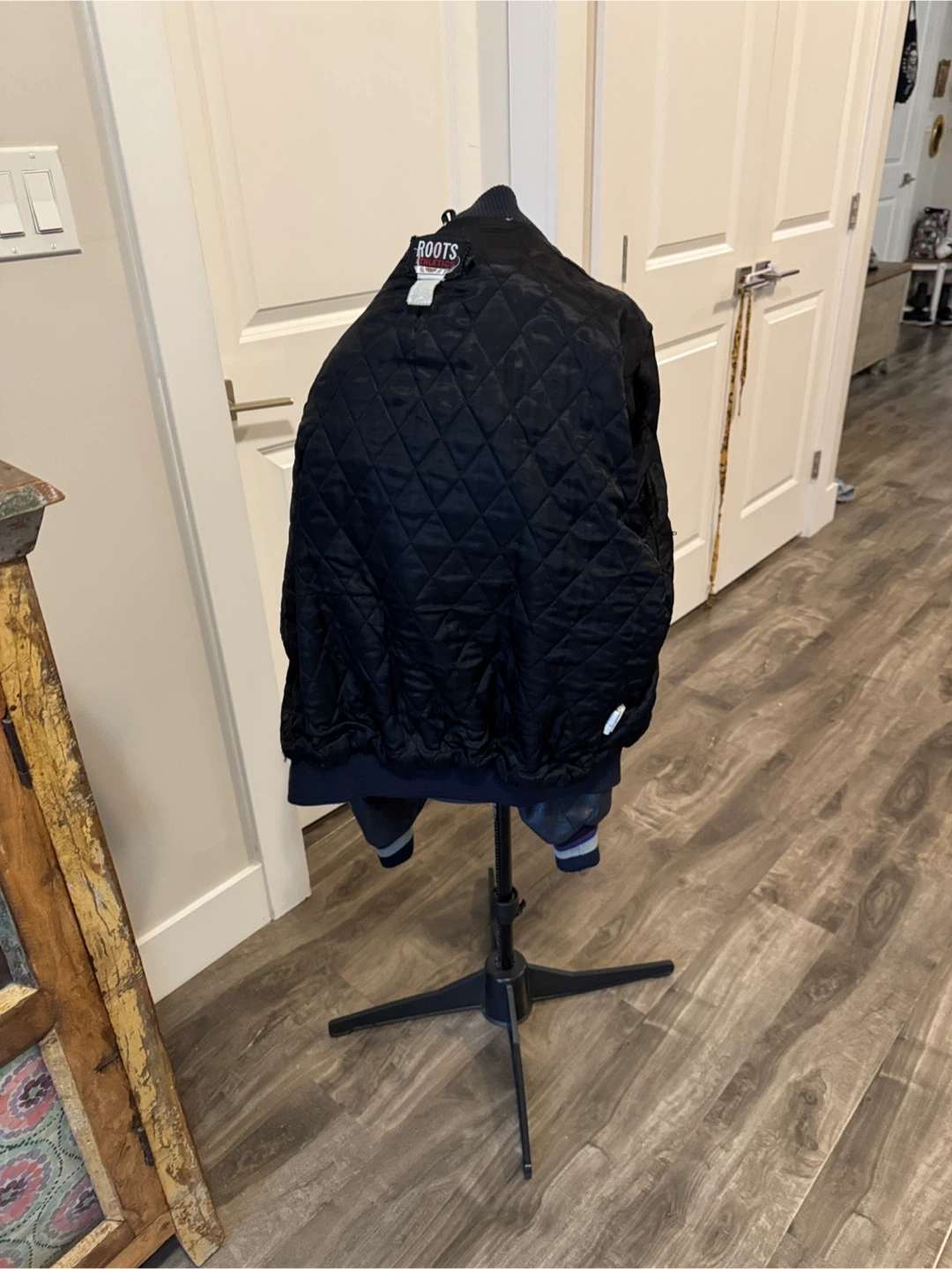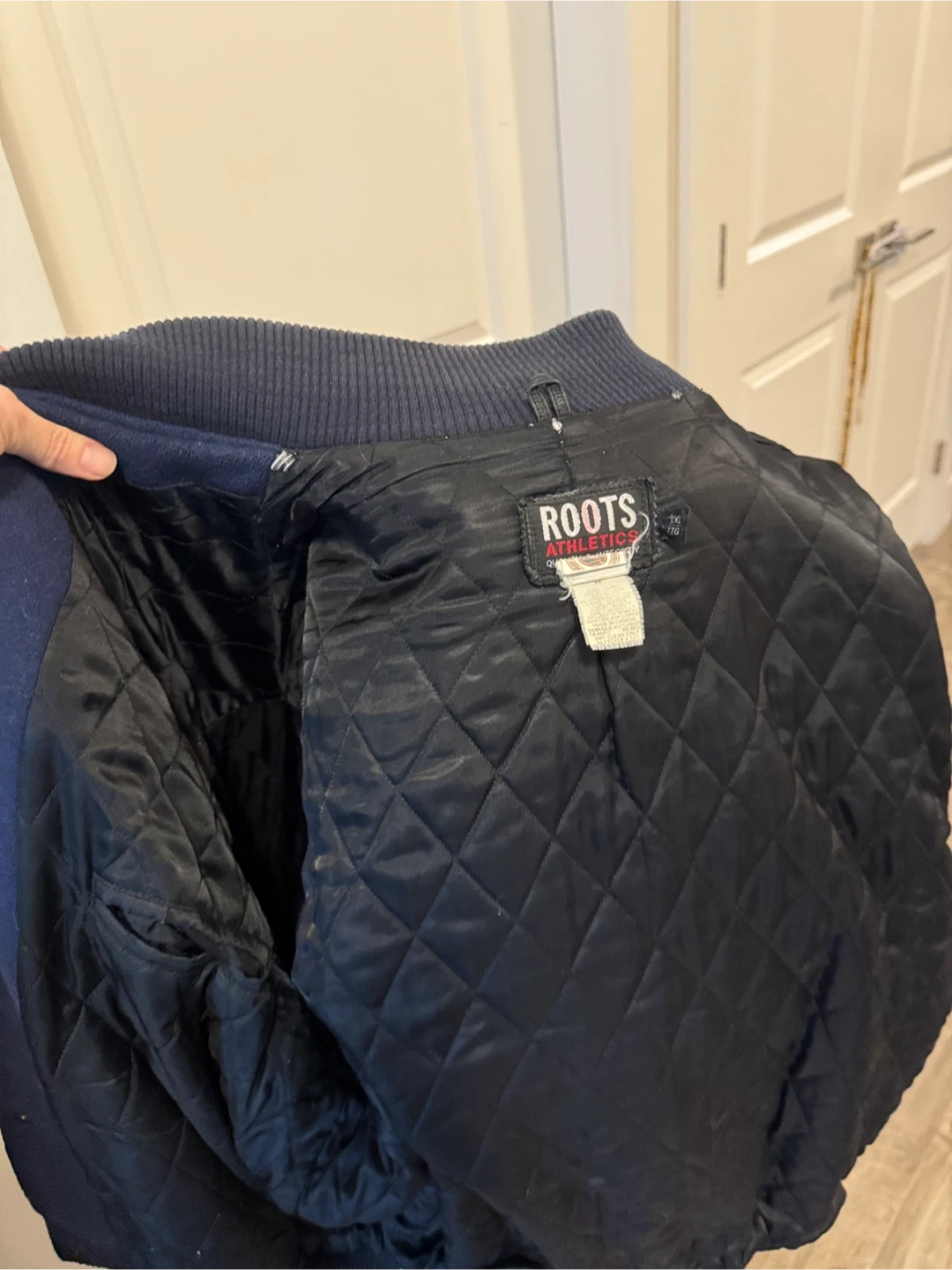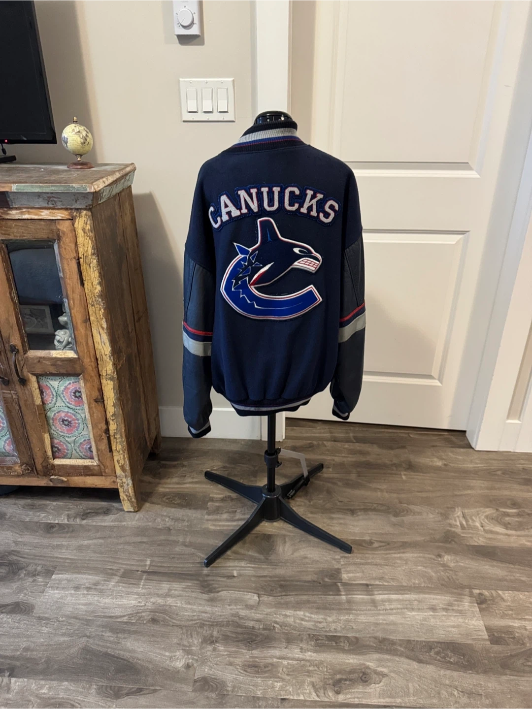 From 2000 so as is wear, small fray holes by collar & hem & under arm but mended. Minor fuzz. Leather sleeves & leather pocket trim. One inner pocket. Super cool vintage collectors piece. Stylish Canucks varsity jacket in navy blue. Features bold logo on the back. Offical NHL product