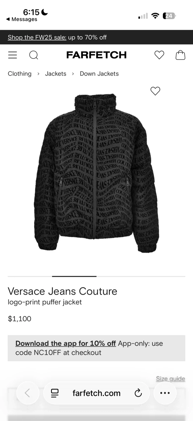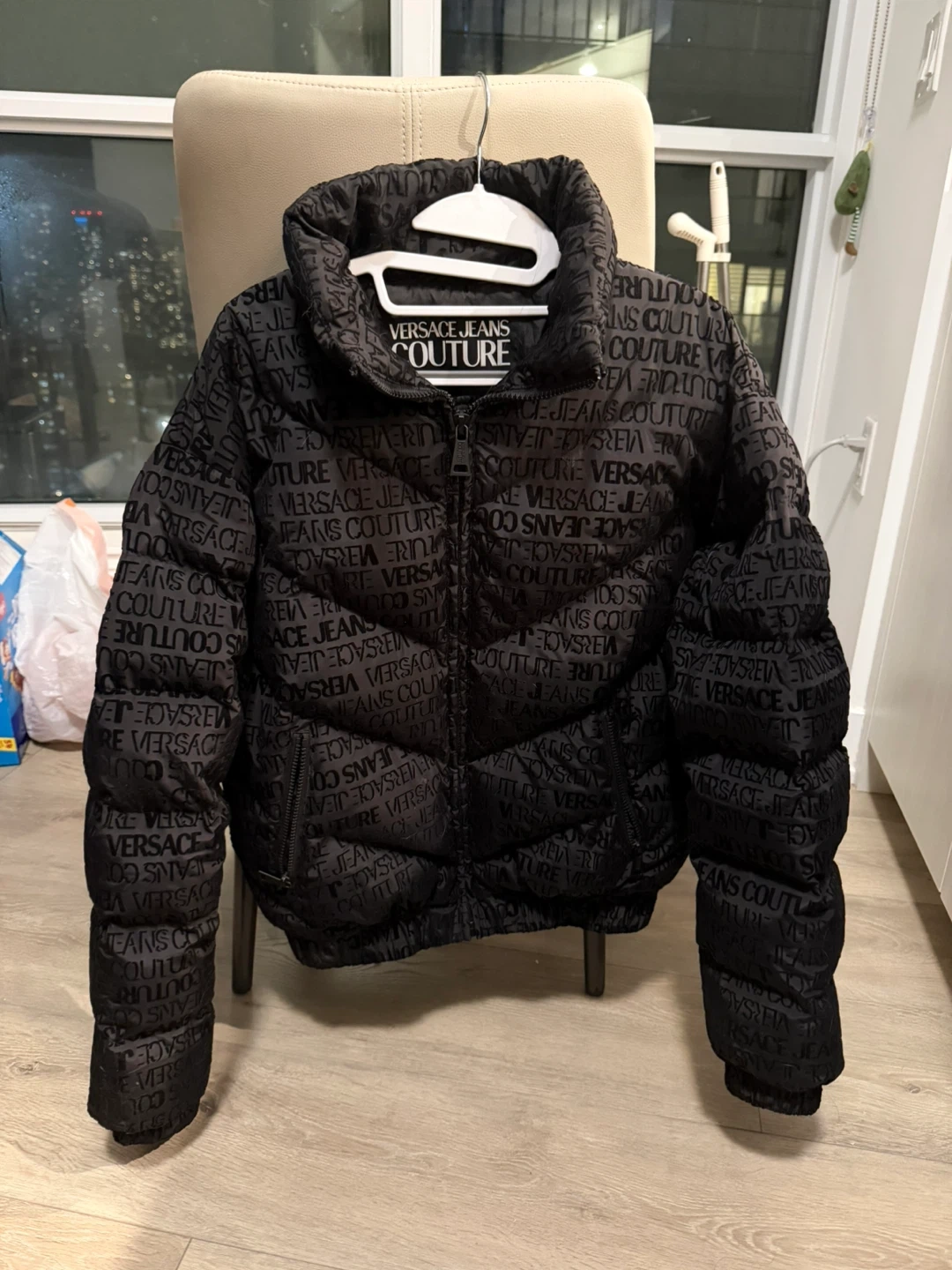 Selling a Versace Jeans Couture logo-print puffer jacket. It's in great condition and features an all-over logo design. Originally bought for $1,100, this stylish jacket is sure to keep you warm and looking fashionable!